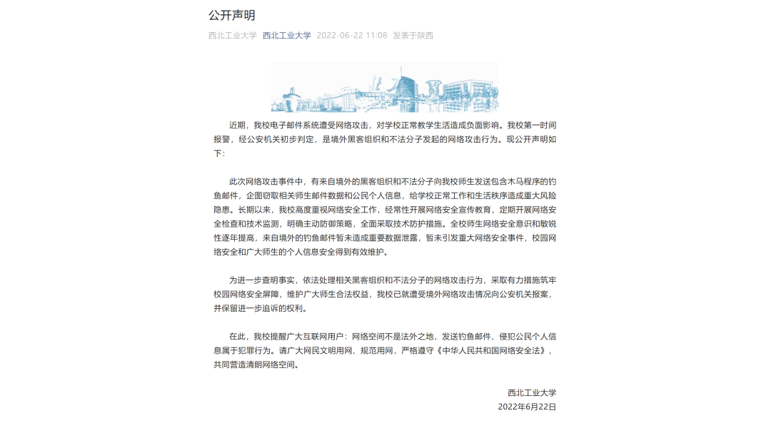 今年6月,西北工业大学发布《公开声明》称,西北工业大学电子邮件系统遭受网络攻击,有来自境外的黑客组织和不法分子向该校师生发送包含木马程序的钓鱼邮件,企图窃取相关师生邮件数据和公民个人信息。