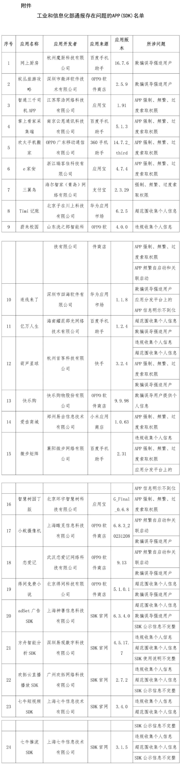 近期,工信部组织第三方检测机构对群众关注的实用工具、本地生活、网络游戏等移动互联网应用程序(APP)及第三方软件开发工具包(SDK)进行检查。发现24款APP、SDK存在侵害用户权益行为,并予以通报。