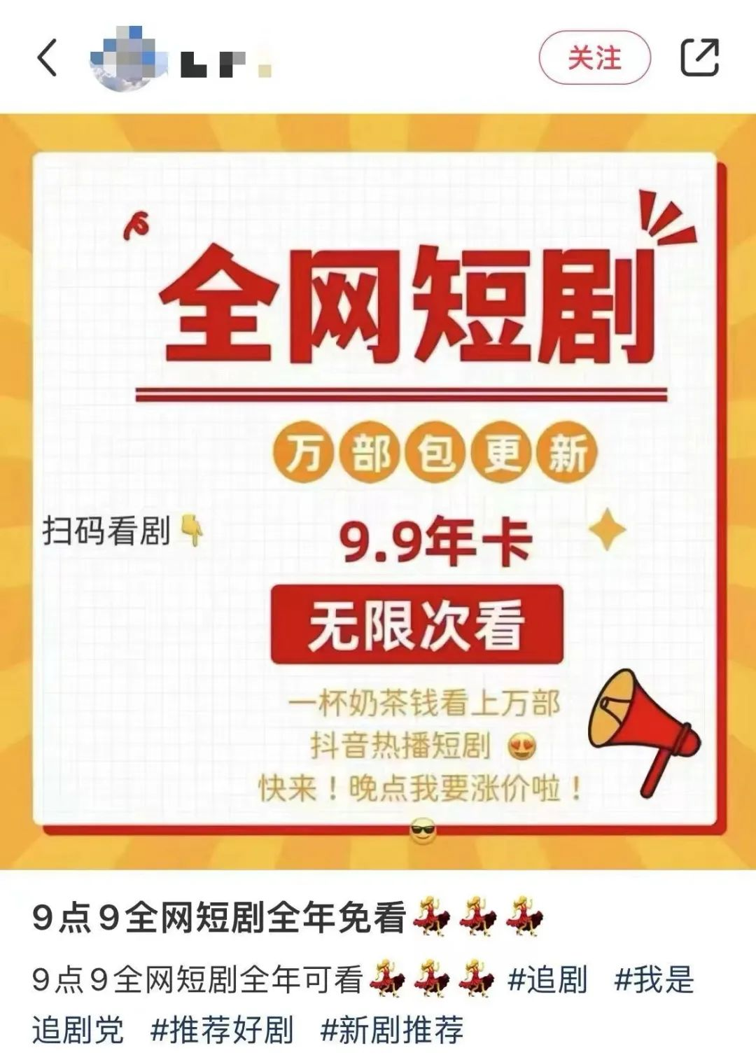 社交平台上发布的“9.9元畅享看短剧”帖子。