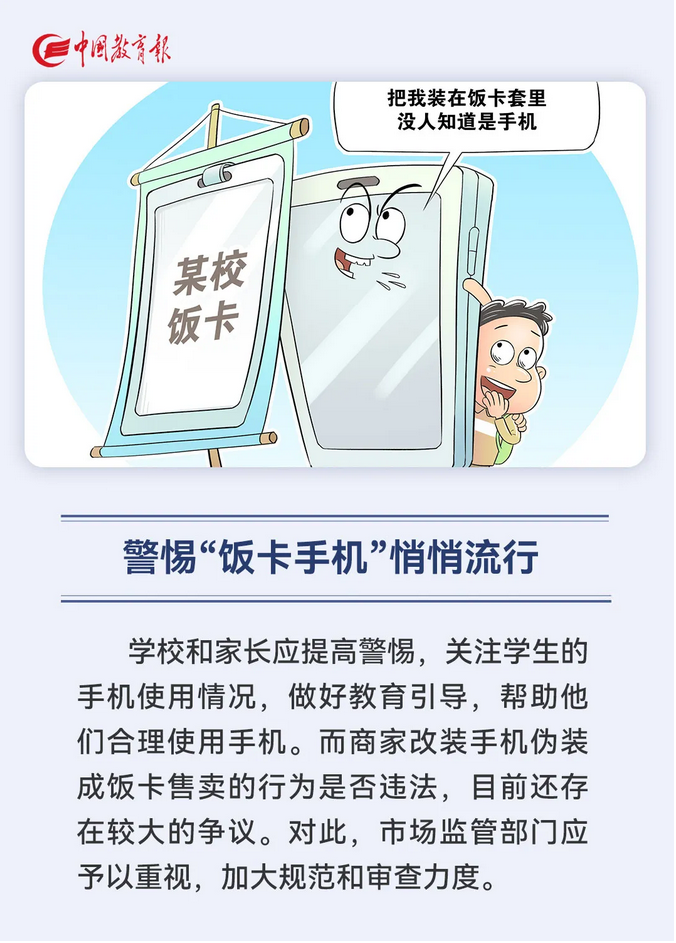 据了解,目前“饭卡手机”价格不高,在一些二手平台上能够轻易购得。而在一些社交平台上,甚至还出现“饭卡手机”改造攻略。这种现象的存在,无疑会加大学生沉迷手机的风险。学校和家长应提高警惕,关注学生的手机使用情况,做好教育引导,帮助他们合理使用手机。而商家改装手机伪装成饭卡售卖的行为是否违法,目前还存在较大的争议。对此,市场监管部门应予以重视,加大规范和审查力度。