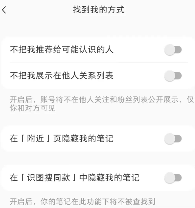 在某分享平台,系统设置藏有猫腻。打开“我”的页面左上方点击三条横线,从“设置”里选择“隐私设置”,可以看出“我的收藏”默认“已公开”。而“找到我的方式”里,平台将“不把我推荐给可能认识的人”“不把我展示在他人关系列表”“在「附近」页隐藏我的笔记”“在「识图搜同款」中隐藏我的笔记”均默认关闭,意味着用户将在无意识中被曝光。“关注与粉丝列表”中,“隐藏我的关注列表”“隐藏我的粉丝列表”也默认关闭。