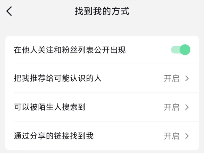 “找到我的方式”中,“在他人关注和粉丝列表公开出现”“把我推荐给可能认识的人”“可以被陌生人搜索到”“通过分享的链接找到我”均默认开启。“关注和粉丝列表”也默认“公开可见”。