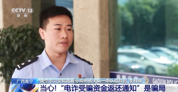 南宁市公安局高新分局刑侦大队一中队指导员 李科琦:骗子利用受害者回款心切的心理诱导其下载诈骗软件并承诺退费,最后诈骗分子引导受害者逐步投入资金,骗子则以操作失误,验收失败等为由,让受害者反复投入资金。