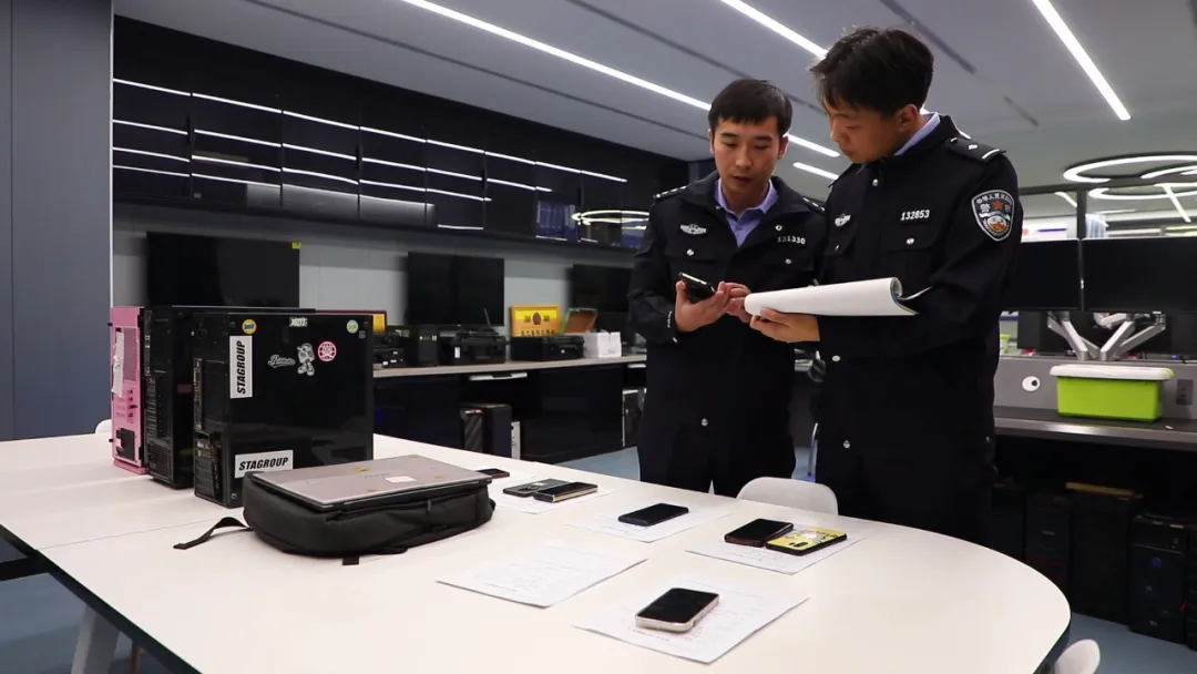 图为警方查获涉案电脑、手机等作案工具。