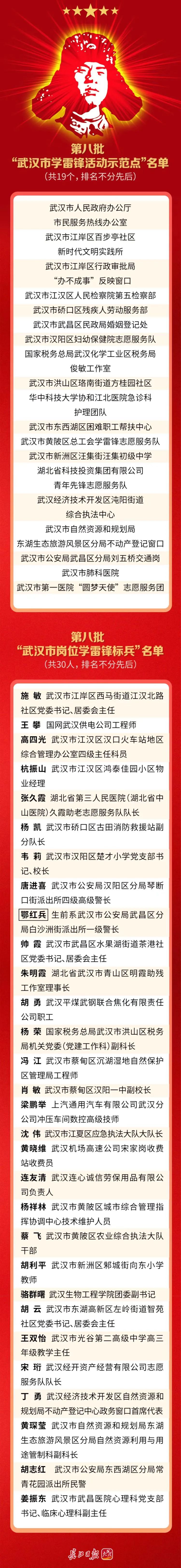 为深入学习宣传贯彻党的二十大精神,贯彻落实习近平总书记关于弘扬雷锋精神的重要指示精神,推动岗位学雷锋活动常态化,让雷锋精神在新时代绽放更加璀璨的光芒,市委宣传部决定,命名武汉市人民政府办公厅市民服务热线办公室等19个单位为“武汉市学雷锋活动示范点”、施敏等30名同志为“武汉市岗位学雷锋标兵”。