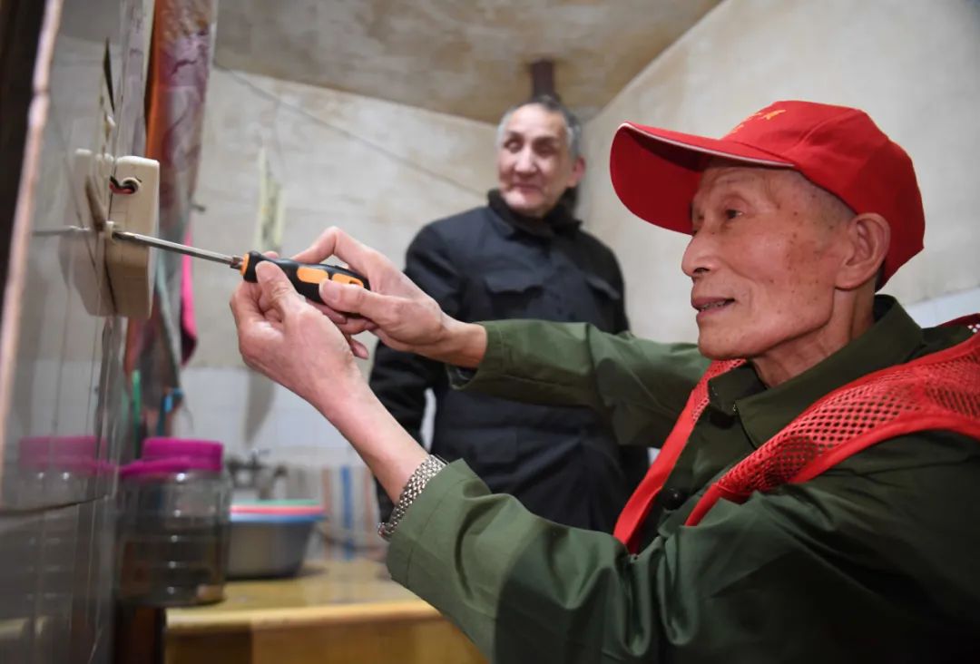 71岁的熊昌金帮助65岁的熊光林检修家里松动的电源插座。