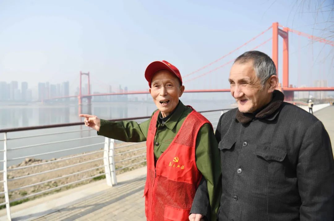 熊昌金(左)引着熊光林(右)到附近的长江边春游、晒太阳,感受春天的气息。熊昌金指着远处的杨泗港大桥告诉记者:他曾带领熊光林在桥上来回步行过。