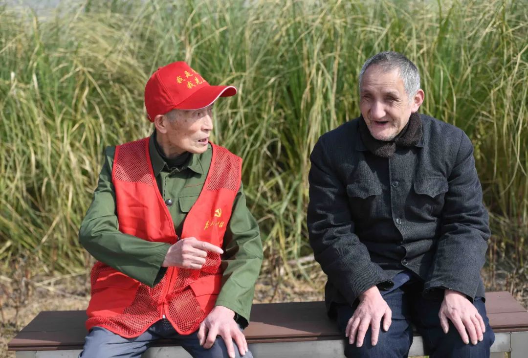 熊昌金(左)和熊光林(右)在附近的长江边晒太阳聊天,感受春天的气息。