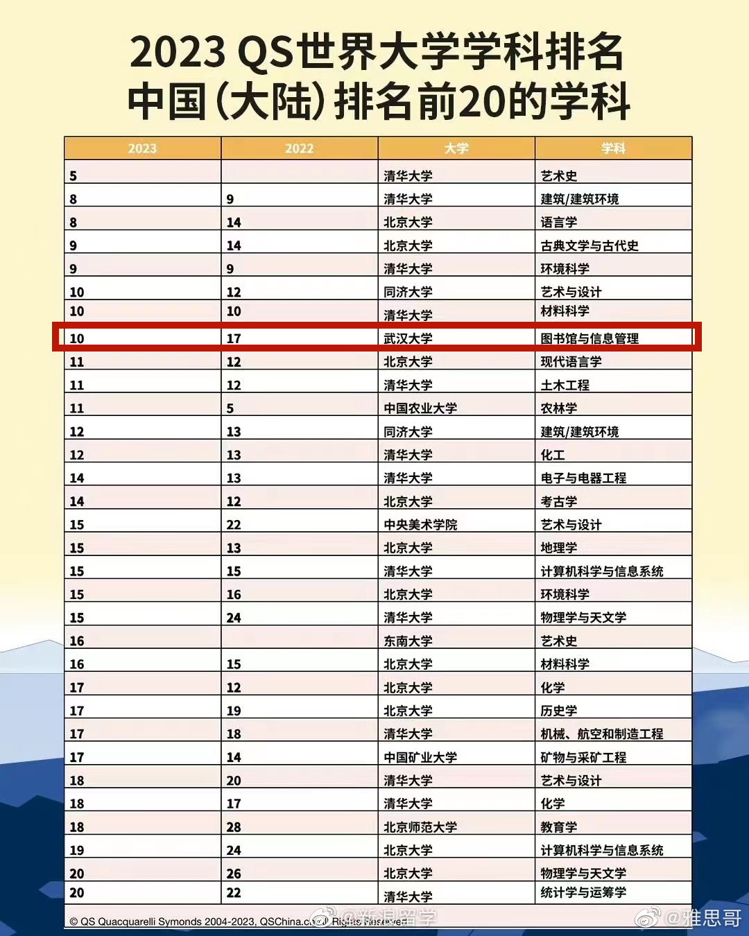 本次学科排名中,中国大陆高校学科项目入榜数量创新高,达到851个(去年为771个)。中国内地共有7个学科进入世界前10强,分别为清华大学(3个)、北京大学(2个)、武汉大学(1个)和同济大学(1个)。21所中国内地高校的123个学科进入世界前50强。其中北京大学38个,清华大学29个,上海交通大学和复旦大学分别有12个和11个学科跻身世界前50。