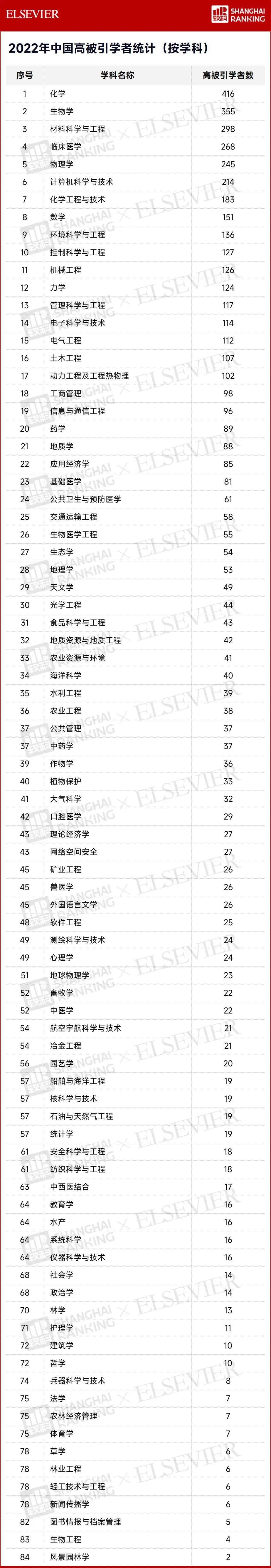 榜单显示,入选的学者共分布在84个不同的学科,其中化学学科高被引学者最多,共416位;生物学、材料科学与工程、临床医学、物理学、计算机科学与技术等学科均超过了200位。
