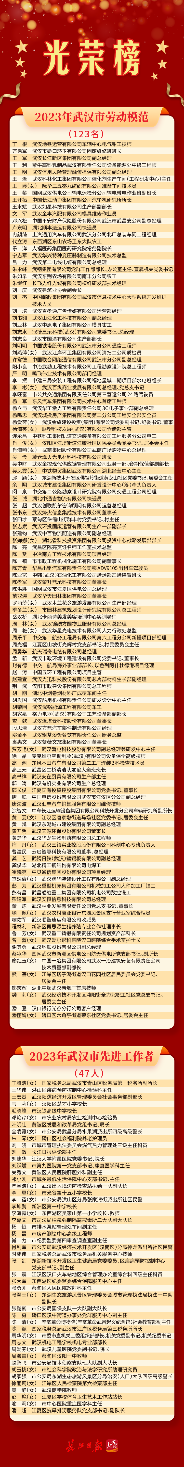 值得一提的是,这次劳模评选表彰充分体现了服务武汉中心大局的导向,契合我市产业发展要求。在110名市劳模企业职工表彰对象中,“光芯屏端网”新一代信息技术、汽车制造和服务、大健康和生物技术、高端装备制造业、智能建造、商贸物流、现代金融、绿色环保、文化旅游等九大支柱产业领域表彰对象共计74人。
