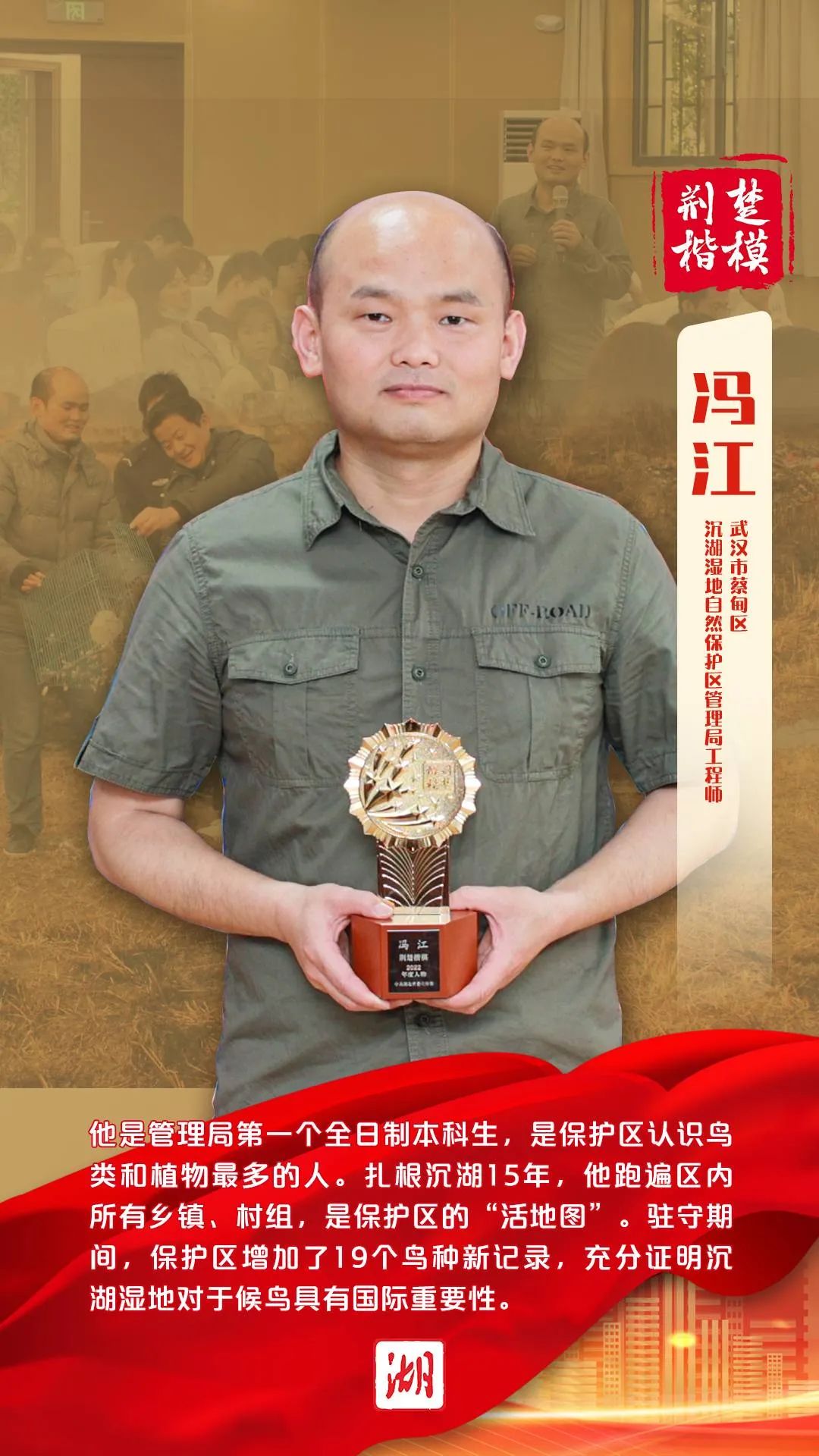 冯江,武汉市蔡甸区沉湖湿地自然保护区管理局工程师。他是管理局第一个全日制本科生,是保护区认识鸟类和植物最多的人,也是最熟悉保护区的人。扎根沉湖15年,他跑遍区内所有乡镇、村组,是保护区的“活地图”。