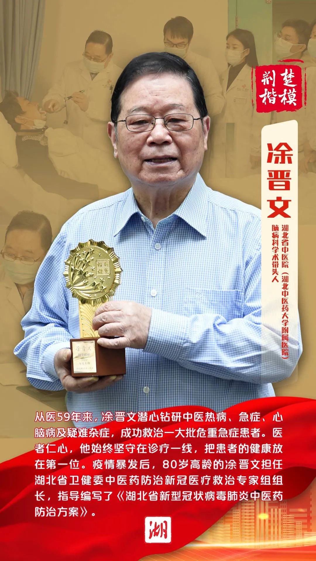 凃晋文,国医大师、湖北省中医院(湖北中医药大学附属医院)脑病科学术带头人。从医59年来,他潜心钻研中医热病、急症、心脑病及疑难杂症,成功救治一大批危重急症患者。