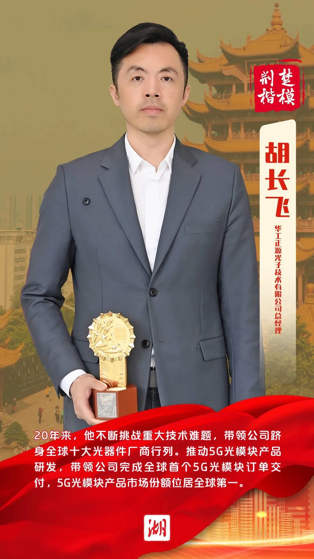 20年来,他不断挑战重大技术难题,带领公司跻身全球十大光器件厂商行列。推动5G光模块产品研发,带领公司完成全球首个5G光模块订单交付,5G光模块产品市场份额位居全球第一……