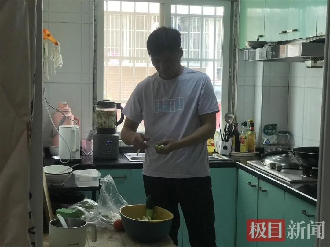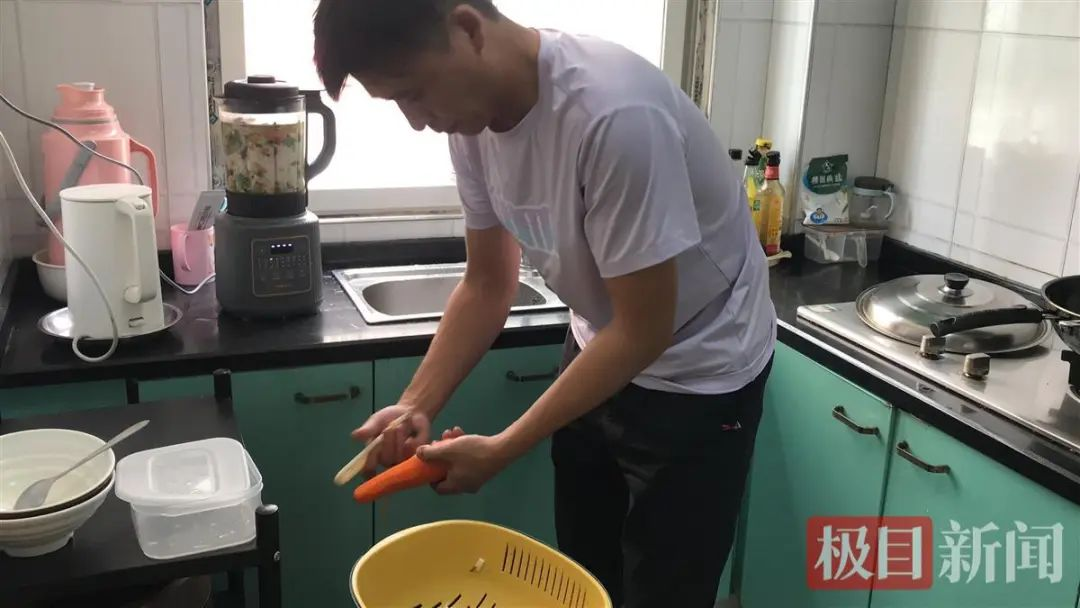 为了保证王明会的营养摄入,王坤会准备牛肉、虾、猪肉、红豆、小米、黑米……丰富又健康,虽然父亲食不知味,也无法咀嚼消化,但他每餐都精心搭配,做成流食后,按点给父亲喂食。一天要喂饭四次,从早上8时多持续到晚上12时,“他对营养有更高的要求,不能让他的身体垮掉。”王坤说,每一餐都有肉、主食,变着花样做。