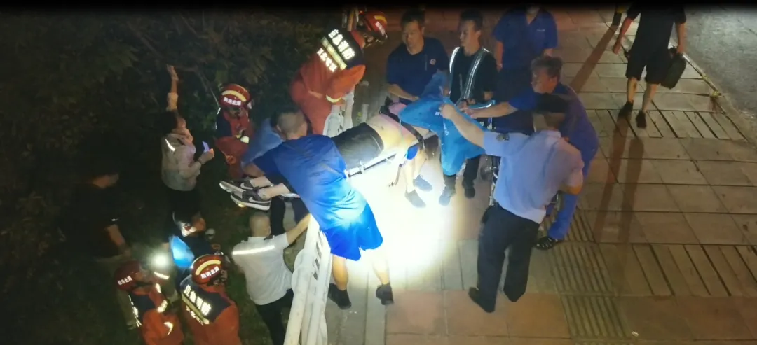 消防员到场时,民警与在场热心群众已将落水女子从水面救至桥下,120医护人员正在现场对落水女子进行急救。由于桥面离桥下有一定的高度,加上环境昏暗,桥下人员难以将落水者转移至桥面。消防员在观察周围地形后,立刻携带救援担架到达桥下,同时展开无人机为救援现场提供照明。在将落水女子抬上救援担架后,众人合力穿越桥洞,从另一侧较平缓处翻越护栏,将落水女子成功转移至路边等候的120救护车上。
