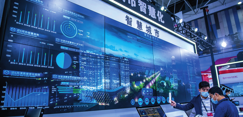 2021 年 5 月 26 日,参会者在 2021 中国国际大数据产业博览会上了解智慧城市治理中心 陶亮摄 / 本刊