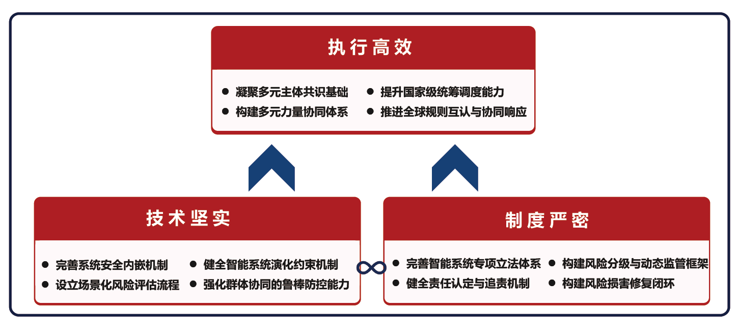 为应对人工智能系统失控风险的系统性挑战,亟须构建以坚实技术支撑、严密制度规范与高效执行机制为支柱的三维联动治理体系。