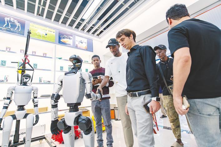 2025年10月14日,外籍客商在浙江义乌全球数贸中心与机器人互动。 (新华社发)