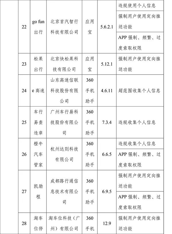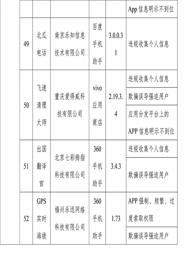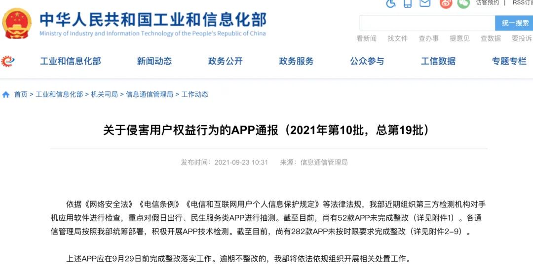 依据《网络安全法》《电信条例》《电信和互联网用户个人信息保护规定》等法律法规,我部近期组织第三方检测机构对手机应用软件进行检查,重点对假日出行、民生服务类APP进行抽测。截至目前,尚有52款APP未完成整改。
