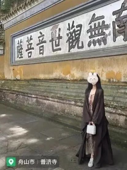 穿上佛教僧服“海青”拍照应将身体完全包裹,这位有意无意地敞开了衣服,露出艳丽的碎花长裙,还将名牌包包捧在身前。