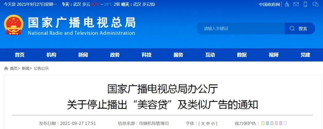 9月27日晚,国家广播电视总局官网发布《国家广播电视总局办公厅关于停止播出“美容贷”及类似广告的通知》,要求自即日起,各广播电视和网络视听机构、平台一律停止播出“美容贷”及类似广告。以下为全文↓