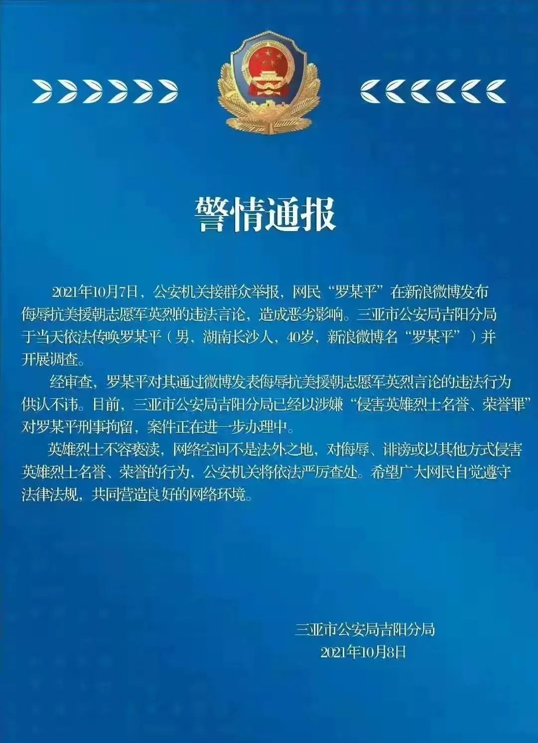 2021年10月7日,公安机关接群众举报,网民“罗某平”在新浪微博发布侮辱抗美援朝志愿军英烈的违法言论,造成恶劣影响。三亚市公安局吉阳分局于当天依法传唤罗某平(男,湖南长沙人,40岁,新浪微博名“罗某平”)并开展调查。