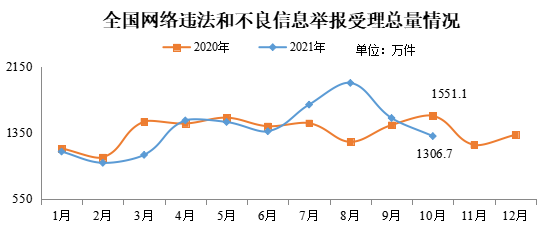 2021年10月全国受理网络违法和不良信息举报1306.7万件