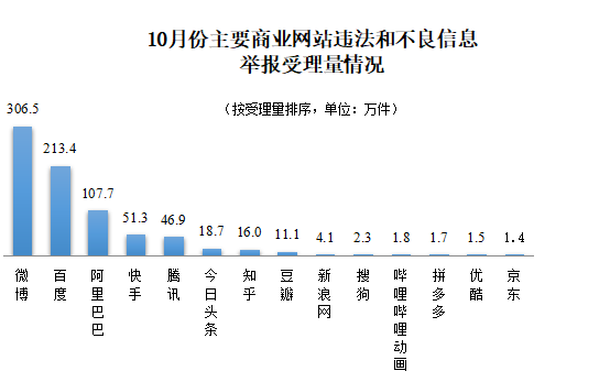 在全国主要网站受理的举报中,微博、百度、阿里巴巴、快手、腾讯、今日头条、知乎、豆瓣、新浪网、搜狗、哔哩哔哩动画、拼多多、优酷、京东等主要商业网站受理量占67.2%,达786.2万件。