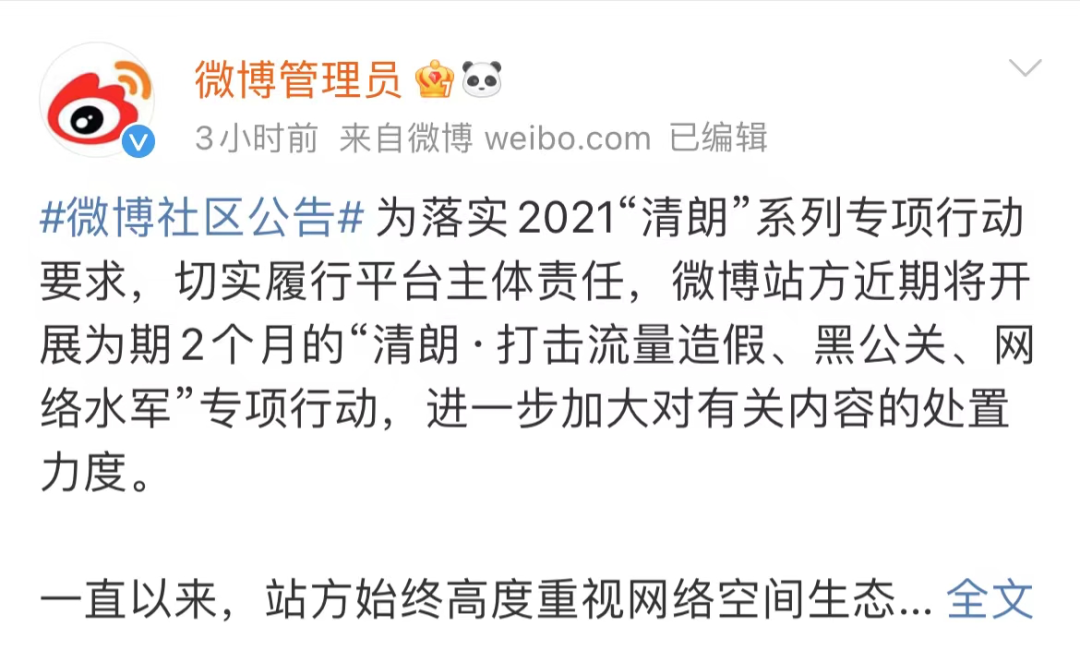 据@微博管理员 12月24日发布社区公告:为落实2021“清朗”系列专项行动要求,切实履行平台主体责任,微博站方近期将开展为期2个月的“清朗·打击流量造假、黑公关、网络水军”专项行动,进一步加大对有关内容的处置力度。