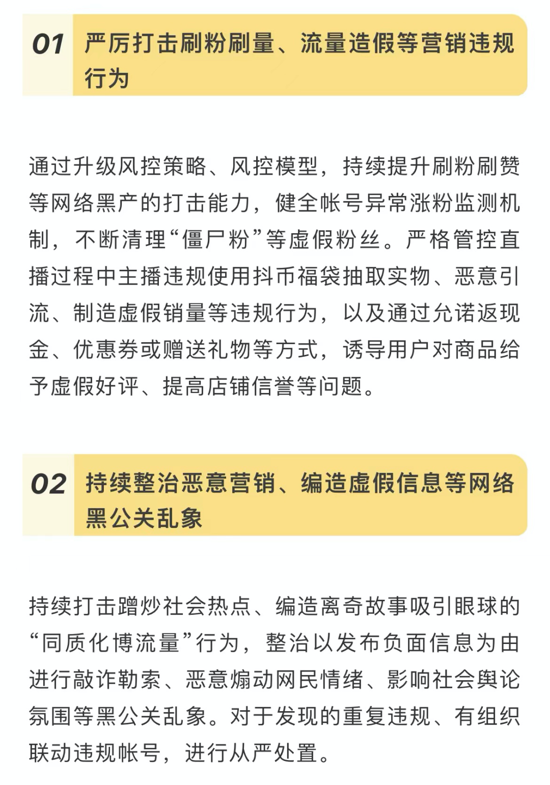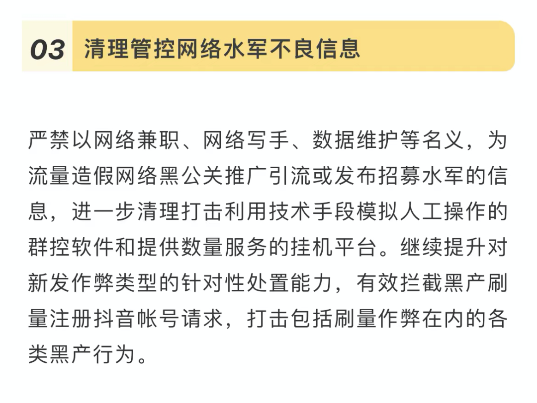 1. 从严治理流量造假问题,将聚焦搜索场景,严格管控账号蹭热搜、恶意引流的行为,重点整治组织水军账号进行刷量增粉、炒作热度等问题。