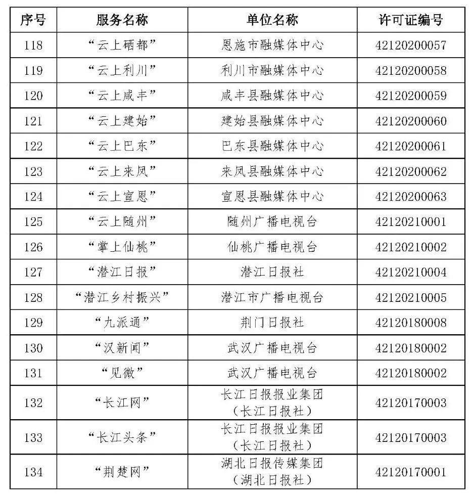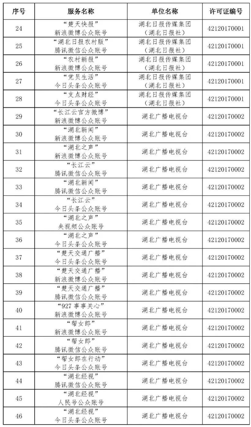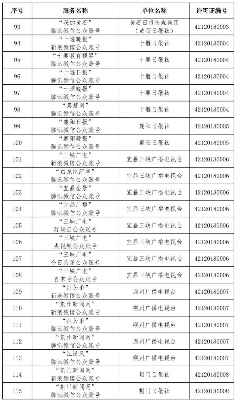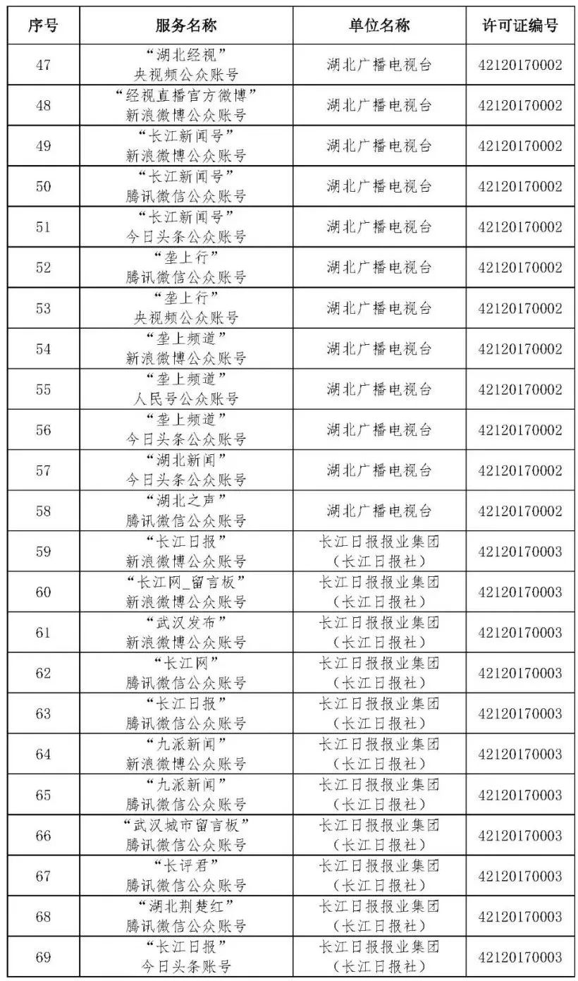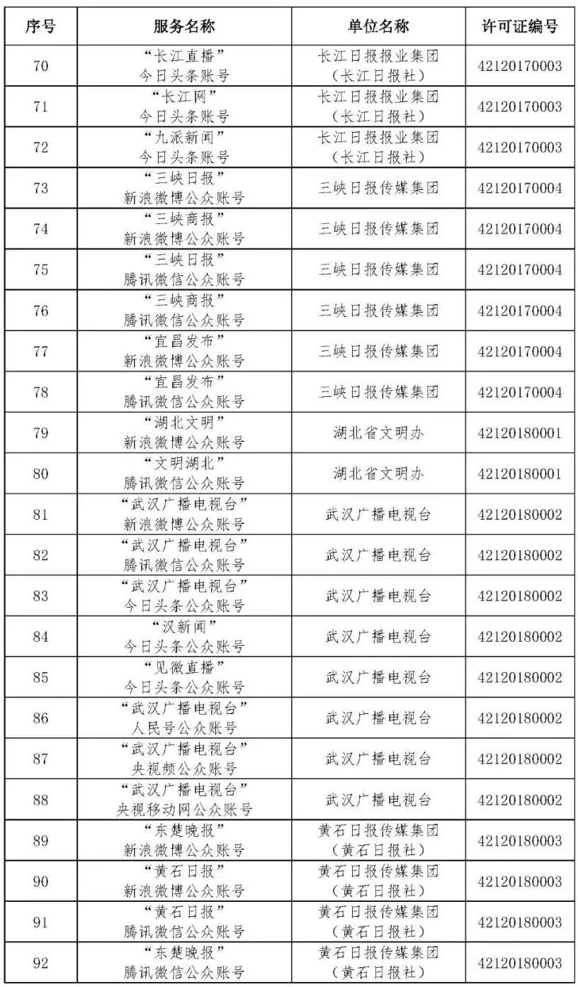 按照国家网信办的统一部署,湖北省网信办依法组织开展了属地互联网新闻信息服务许可证的申请、续办和变更工作,现将已完成申请、续办和变更的111家湖北省互联网新闻信息服务单位取得的相关许可信息予以公开,包括:互联网站94个,应用程序134个,论坛13个,公众账号427个,小程序4个,共计672个服务项。
