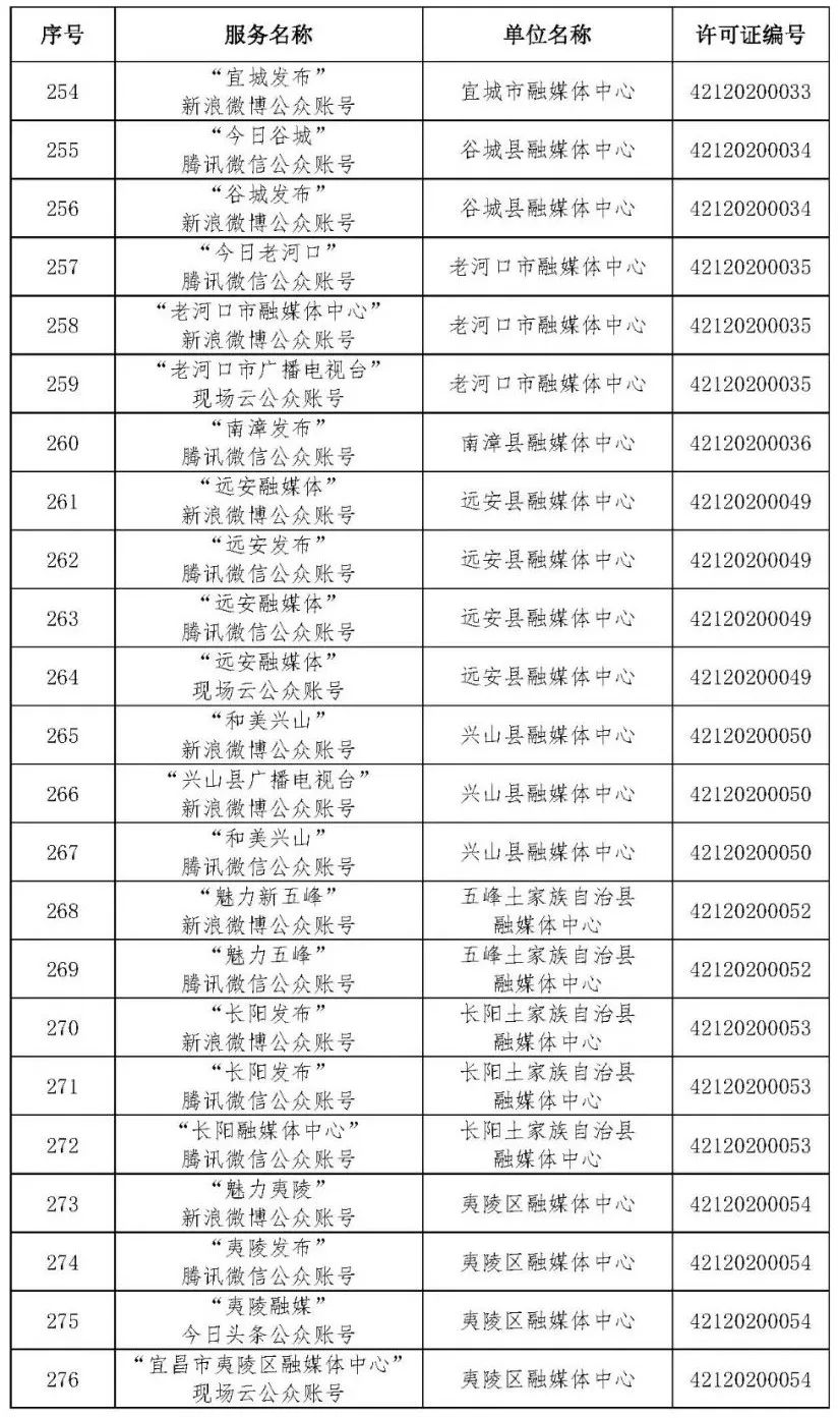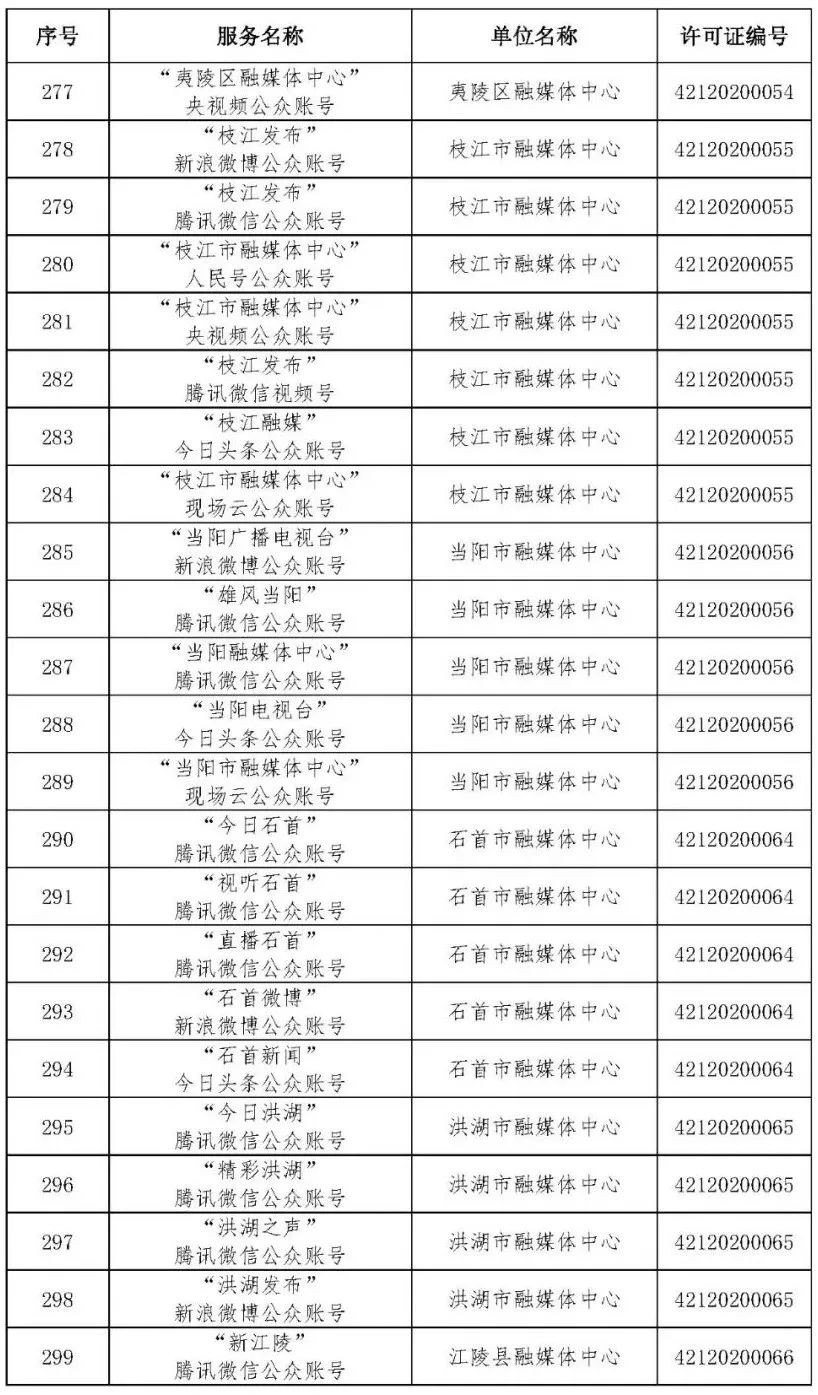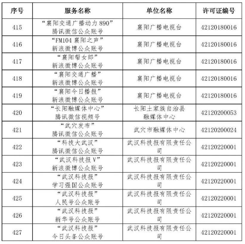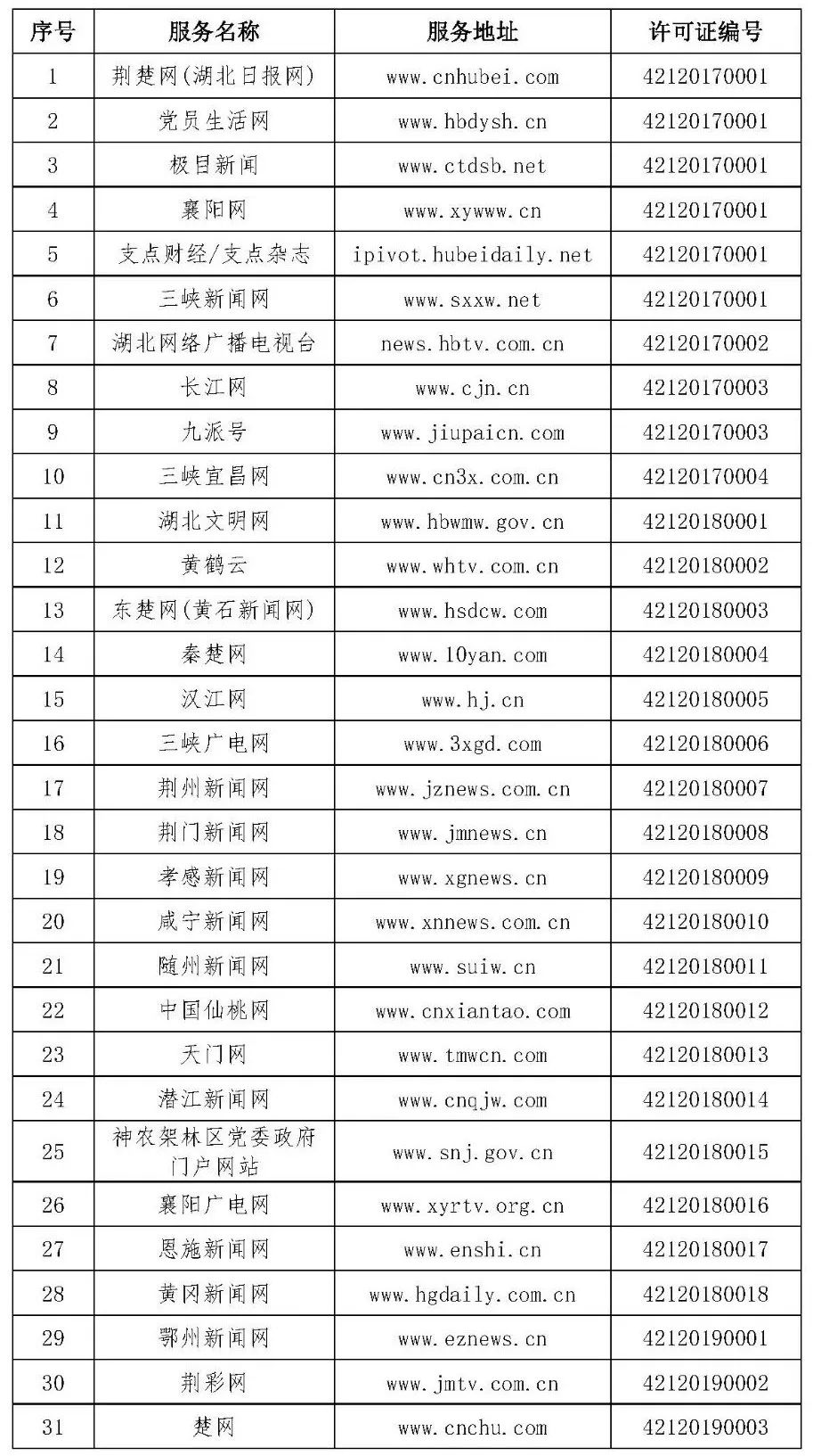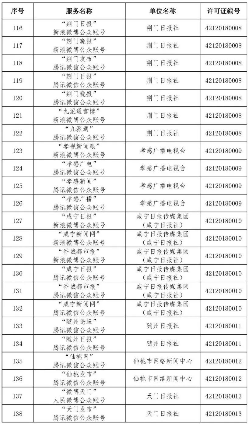 按照国家网信办的统一部署,湖北省网信办依法组织开展了属地互联网新闻信息服务许可证的申请、续办和变更工作,现将已完成申请、续办和变更的111家湖北省互联网新闻信息服务单位取得的相关许可信息予以公开,包括:互联网站94个,应用程序134个,论坛13个,公众账号427个,小程序4个,共计672个服务项。