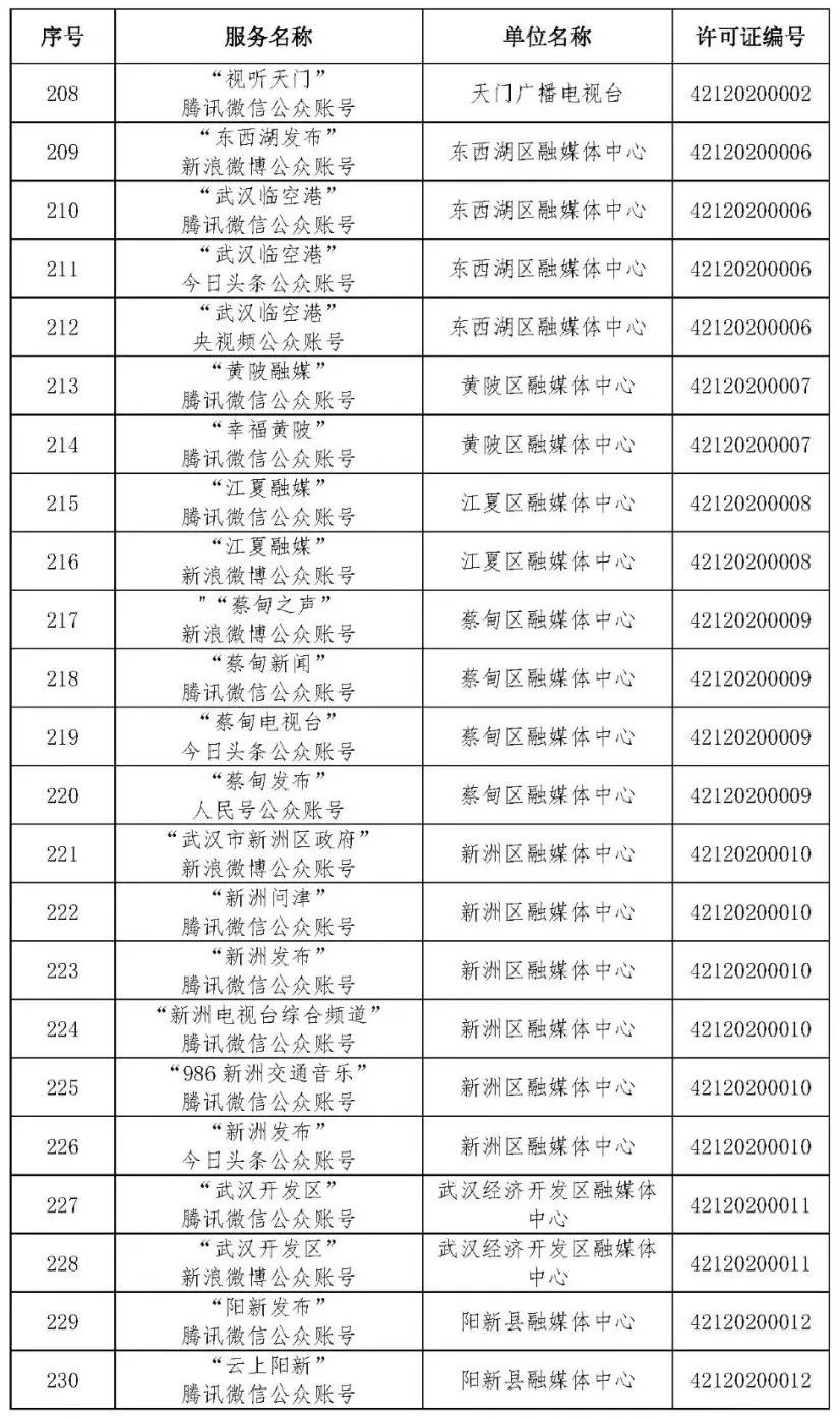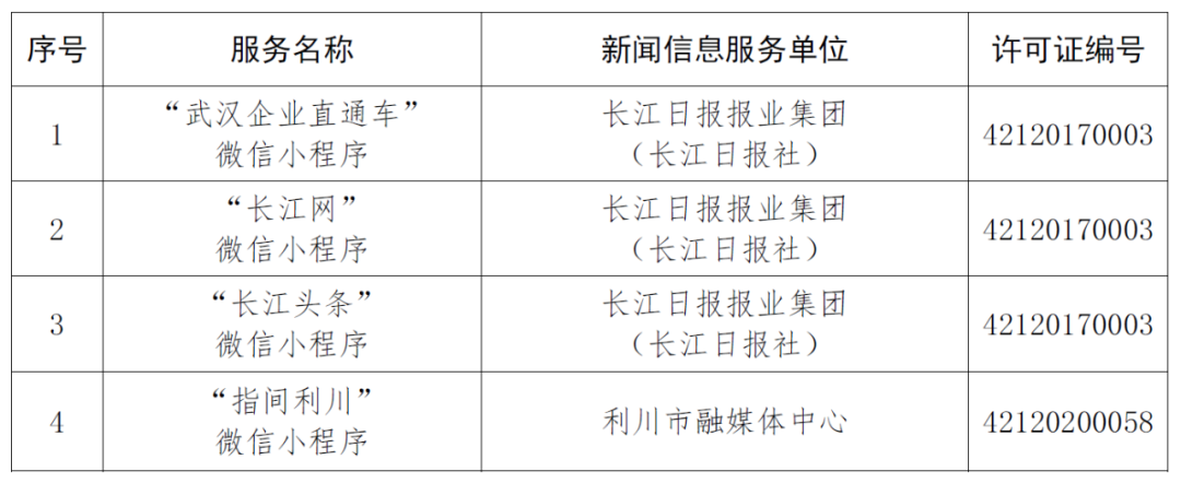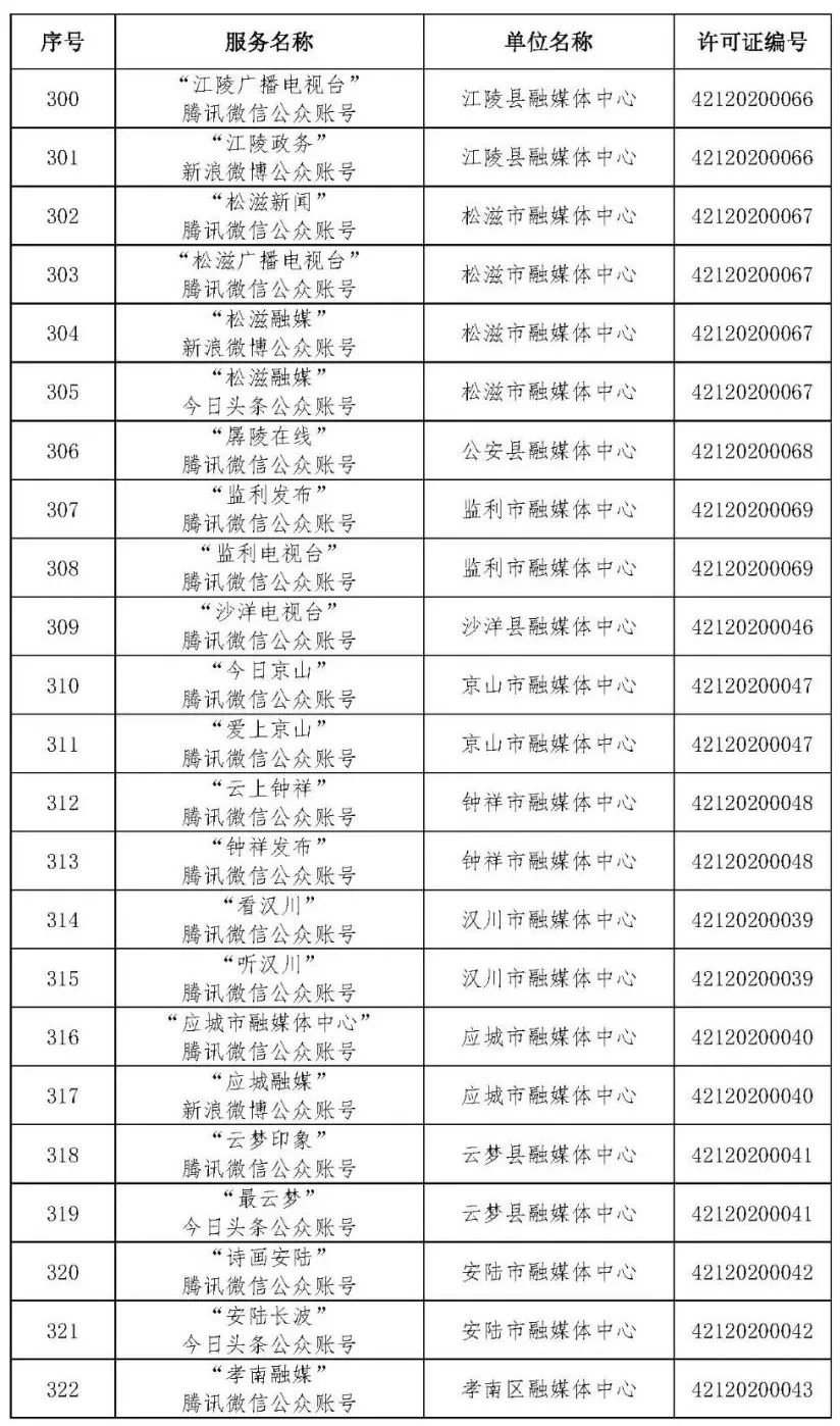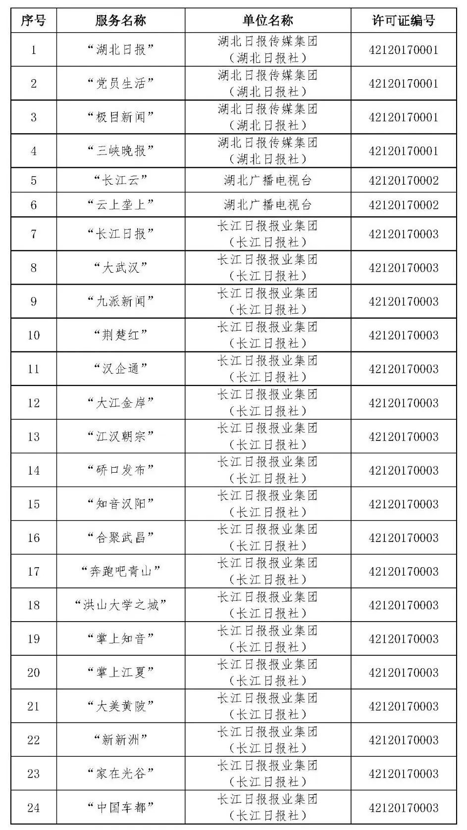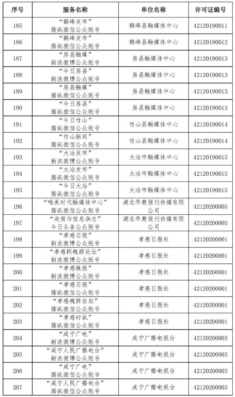 按照国家网信办的统一部署,湖北省网信办依法组织开展了属地互联网新闻信息服务许可证的申请、续办和变更工作,现将已完成申请、续办和变更的111家湖北省互联网新闻信息服务单位取得的相关许可信息予以公开,包括:互联网站94个,应用程序134个,论坛13个,公众账号427个,小程序4个,共计672个服务项。
