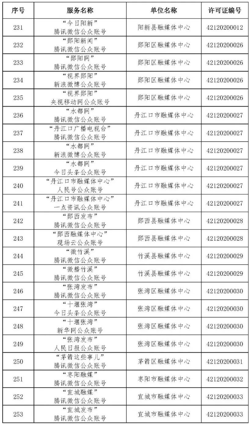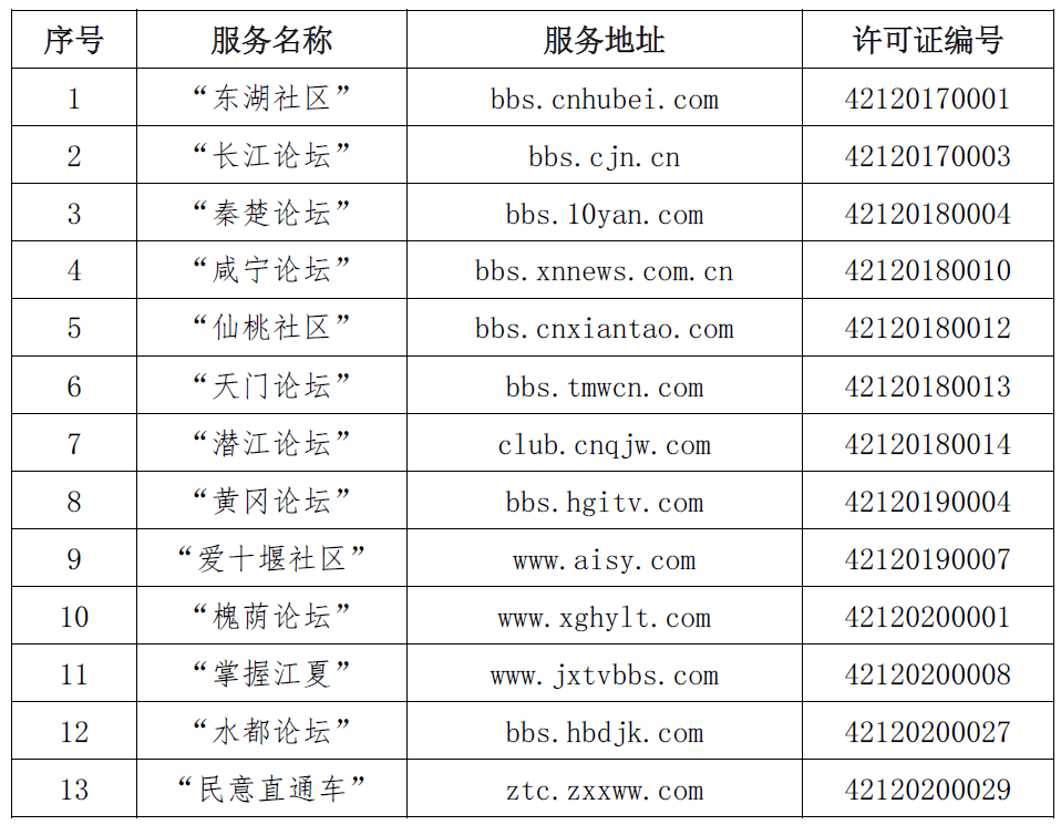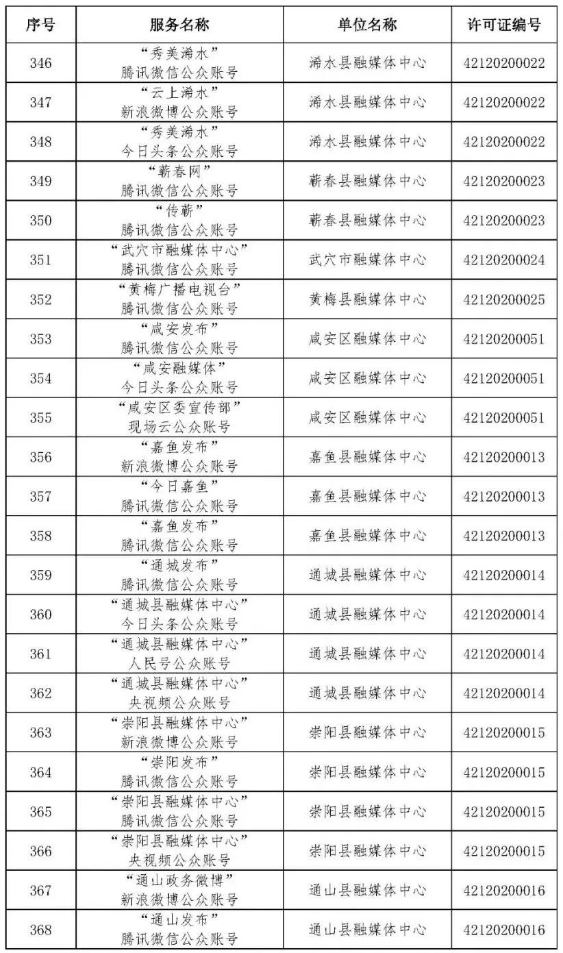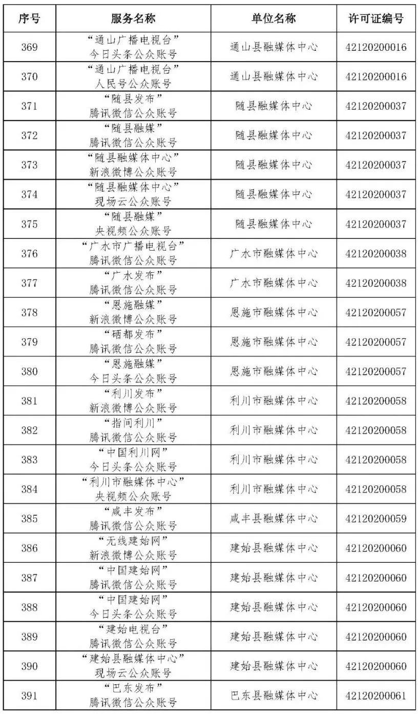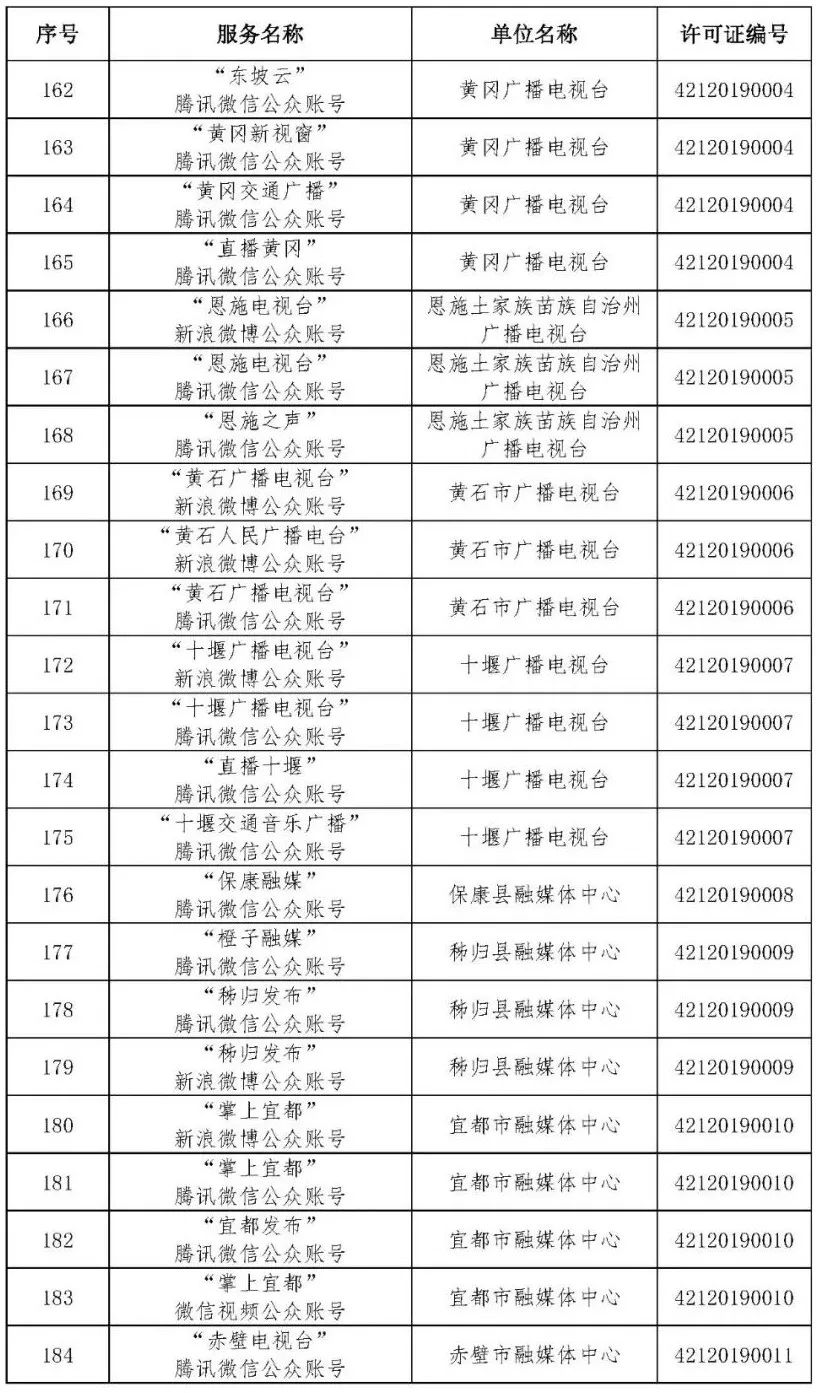 按照国家网信办的统一部署,湖北省网信办依法组织开展了属地互联网新闻信息服务许可证的申请、续办和变更工作,现将已完成申请、续办和变更的111家湖北省互联网新闻信息服务单位取得的相关许可信息予以公开,包括:互联网站94个,应用程序134个,论坛13个,公众账号427个,小程序4个,共计672个服务项。
