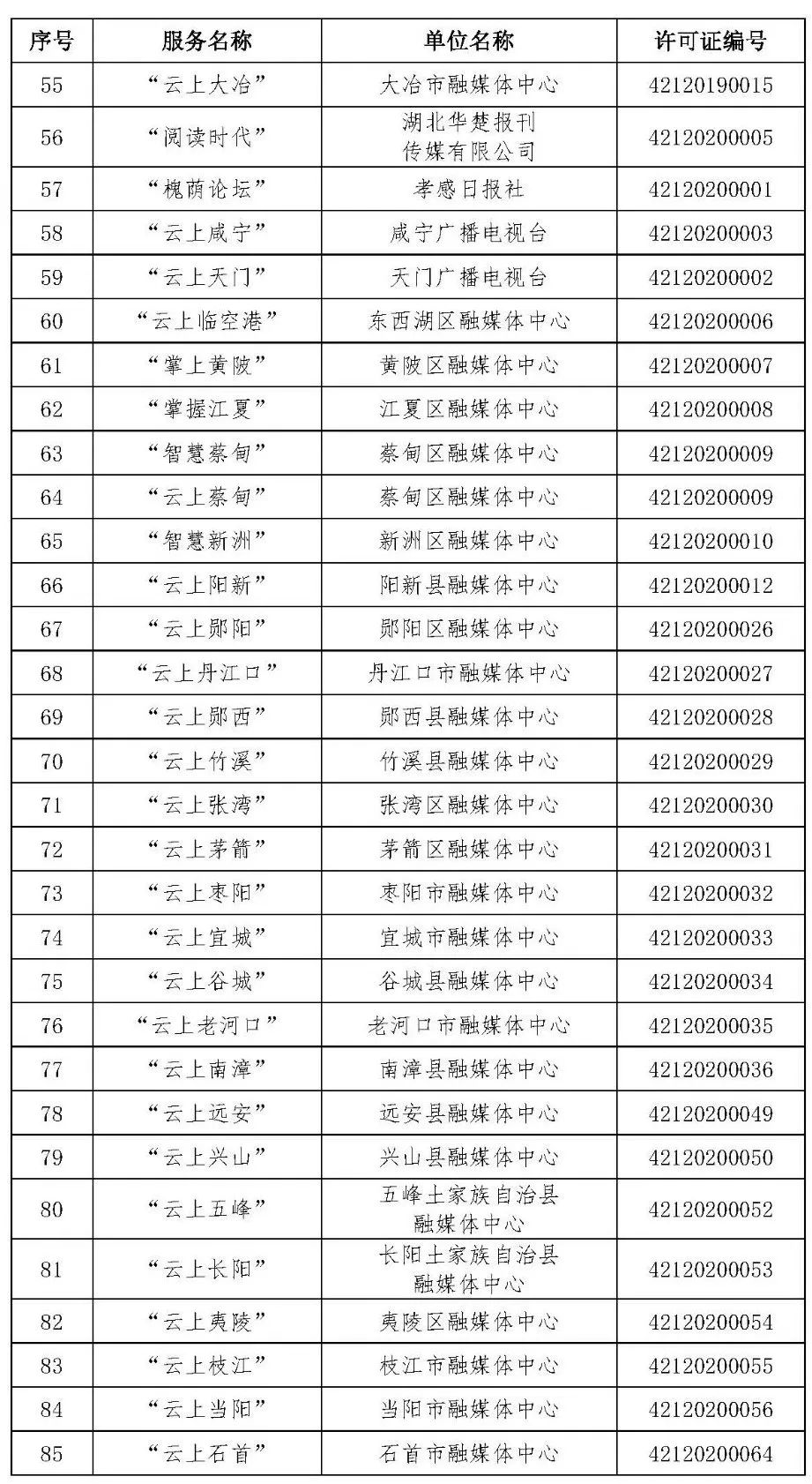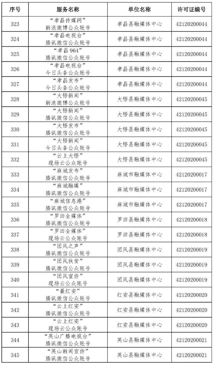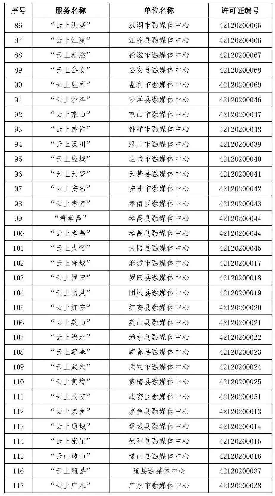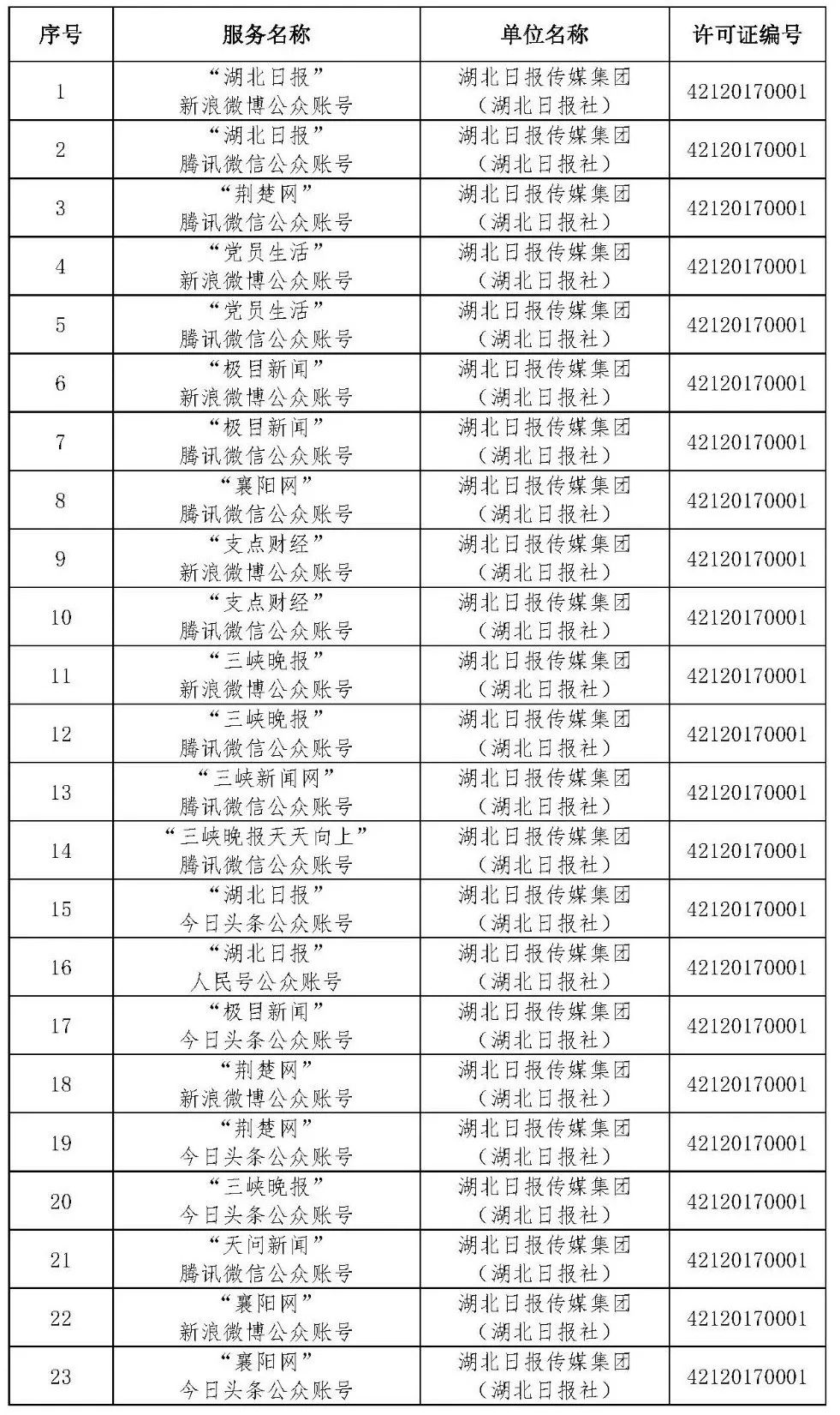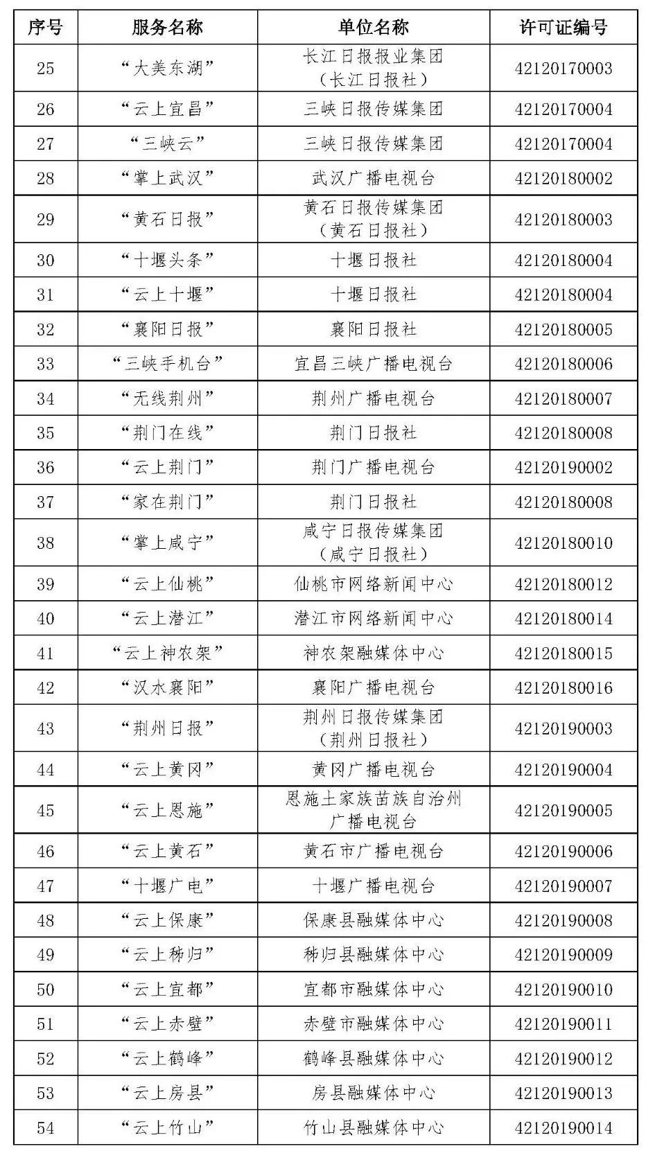 按照国家网信办的统一部署,湖北省网信办依法组织开展了属地互联网新闻信息服务许可证的申请、续办和变更工作,现将已完成申请、续办和变更的111家湖北省互联网新闻信息服务单位取得的相关许可信息予以公开,包括:互联网站94个,应用程序134个,论坛13个,公众账号427个,小程序4个,共计672个服务项。