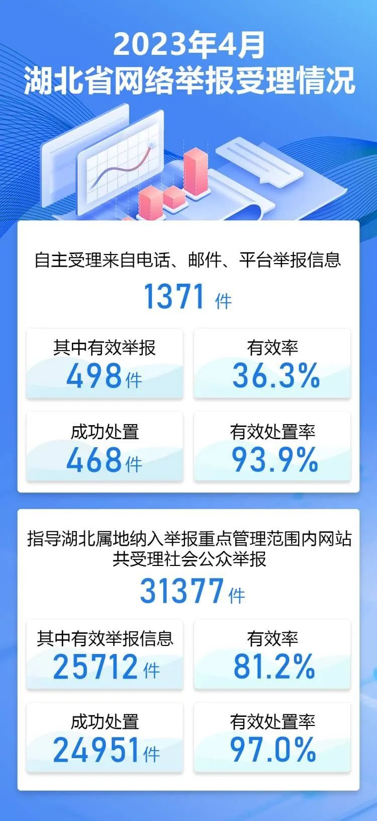 4月份,湖北省互联网违法和不良信息举报中心自主受理来自电话、邮件、平台举报信息1371件,其中有效举报498件,有效率36.3%,成功处置468件,有效处置率93.9%;指导湖北属地纳入举报重点管理范围内网站共受理社会公众举报31377件,其中有效举报信息25712件,有效率81.2%,成功处置24951件,有效处置率97.0%。