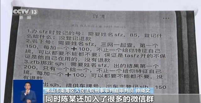 佛山市南海区人民法院刑事审判庭审判员 钟绮文:在陈某未在岗的期间,就通过他的同事等人帮忙查询,同时陈某就会支付大概5元到10元不等的查询费。同时陈某还加入了很多的微信群,在微信群里面发布了大量的查询的广告。