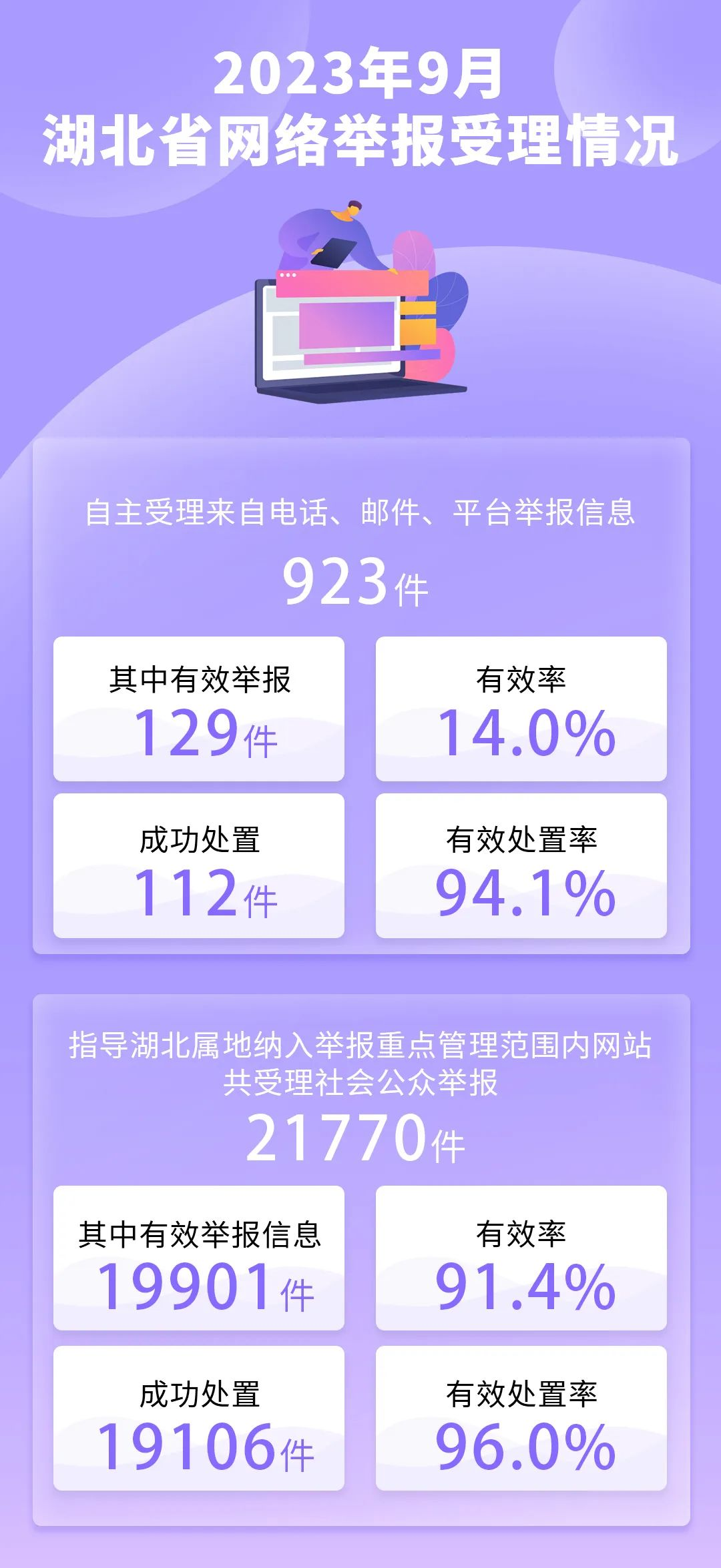 9月份,湖北省互联网违法和不良信息举报中心自主受理来自电话、邮件、平台举报信息923件,其中有效举报129件,有效率14.0%,成功处置112件,有效处置率94.1%;指导湖北属地纳入举报重点管理范围内网站共受理社会公众举报21770件,其中有效举报信息19901件,有效率91.4%,成功处置19106件,有效处置率96.0%。
