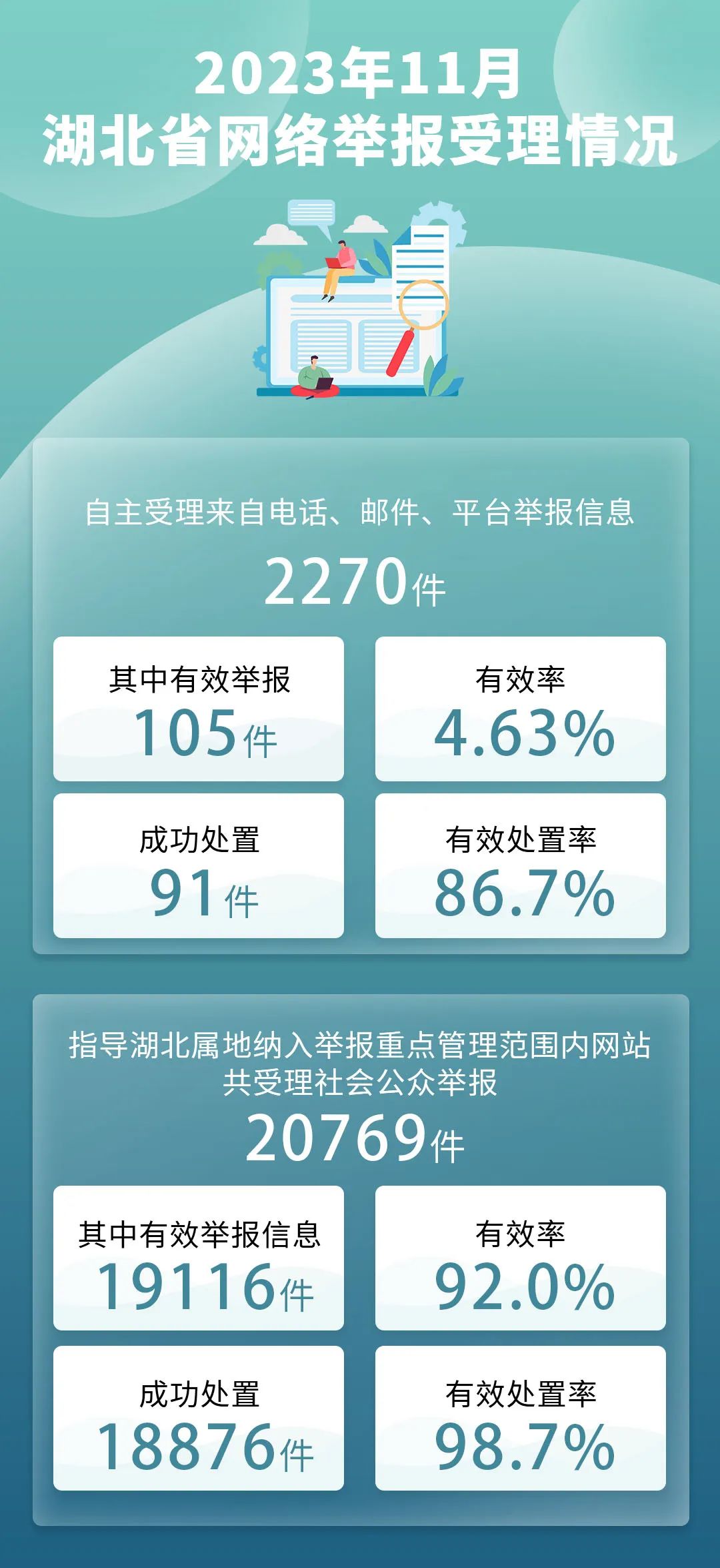 11月份,湖北省互联网违法和不良信息举报中心自主受理来自电话、邮件、平台举报信息2270件,其中有效举报105件,有效率4.63%,成功处置91件,有效处置率86.7%;指导湖北属地纳入举报重点管理范围内网站共受理社会公众举报20769件,其中有效举报信息19116件,有效率92.0%,成功处置18876件,有效处置率98.7%。