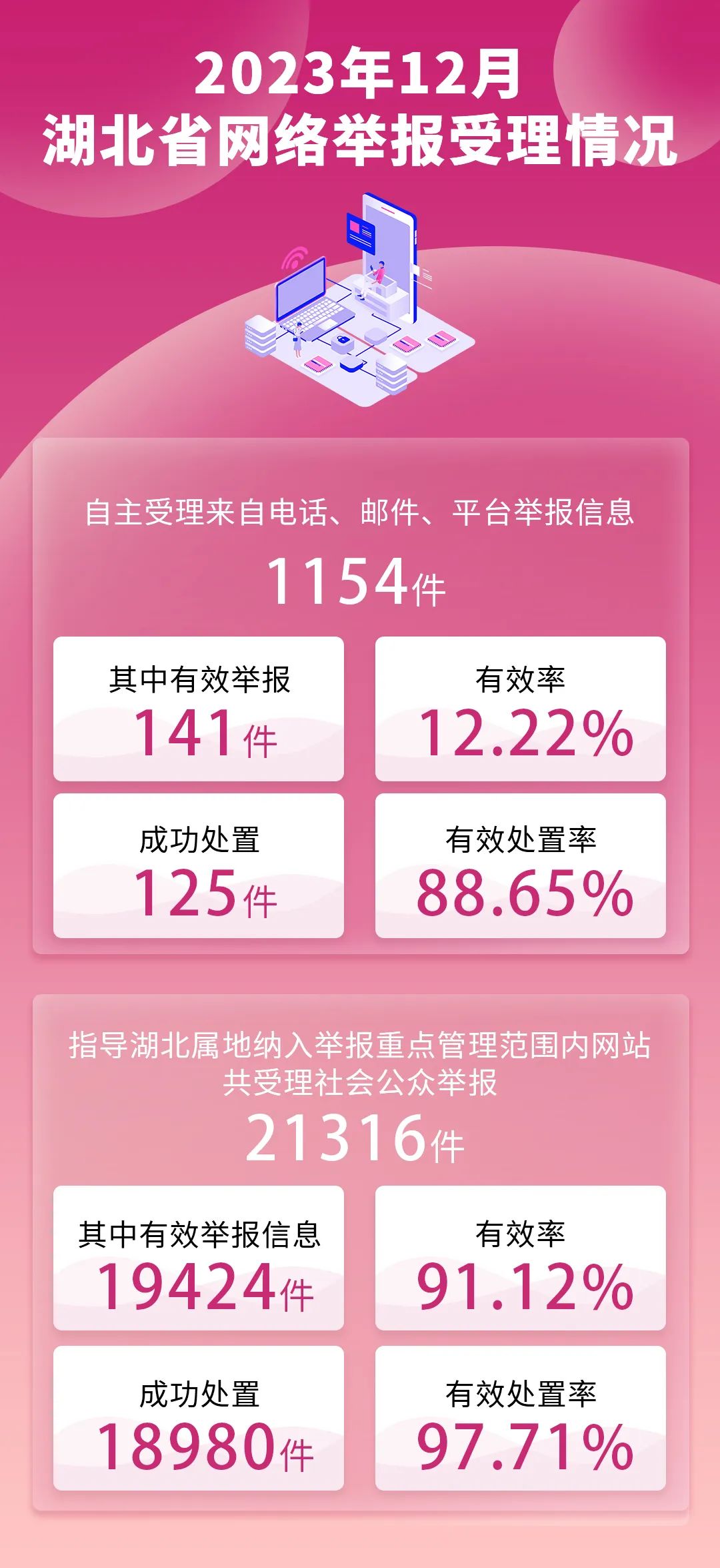 12月份,湖北省互联网违法和不良信息举报中心自主受理来自电话、邮件、平台举报信息1154件,其中有效举报141件,有效率12.22%,成功处置125件,有效处置率88.65%;指导湖北属地纳入举报重点管理范围内网站共受理社会公众举报21316件,其中有效举报信息19424件,有效率91.12%,成功处置18980件,有效处置率97.71%。