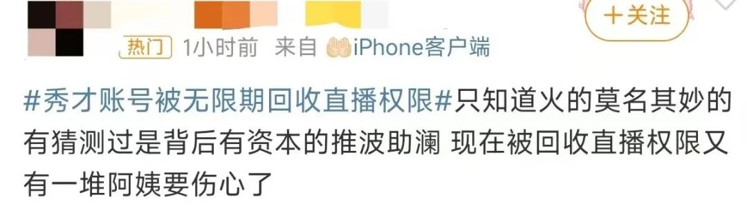 对于秀才账号被无限期回收直播权限,不少网友纷纷表示支持称,老太太们的退休金保住了。