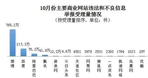 在全国主要网站受理的举报中,微博、百度、阿里巴巴、腾讯、新浪网、今日头条等主要商业网站受理量占78.6%,达1117.9万件。