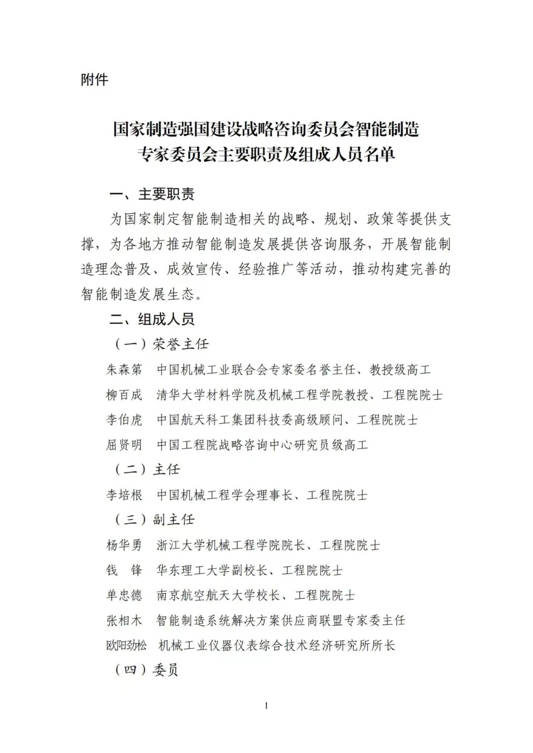 为落实《“十四五”智能制造发展规划》,加强智能制造前瞻性和战略性问题研究,提升研究水平和支撑能力,决定成立国家制造强国建设战略咨询委员会智能制造专家委员会,主要职责和人员名单详见附件。