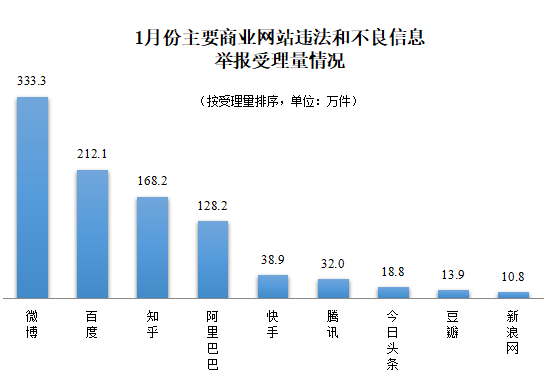 在全国主要网站受理的举报中,微博、百度、知乎、阿里巴巴、快手、腾讯、今日头条、豆瓣、新浪网等主要商业网站受理量占72.3%,达968.6万件。