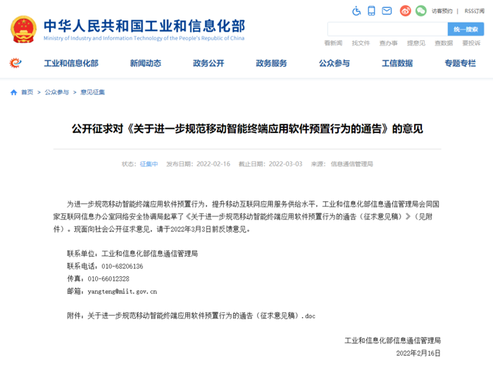 据工信部网站16日消息,工信部公开征求对《关于进一步规范移动智能终端应用软件预置行为的通告》的意见。《通告》提出,生产企业应确保除基本功能软件外的预置应用软件均可卸载,并提供安全便捷的卸载方式供用户选择。全文如下: