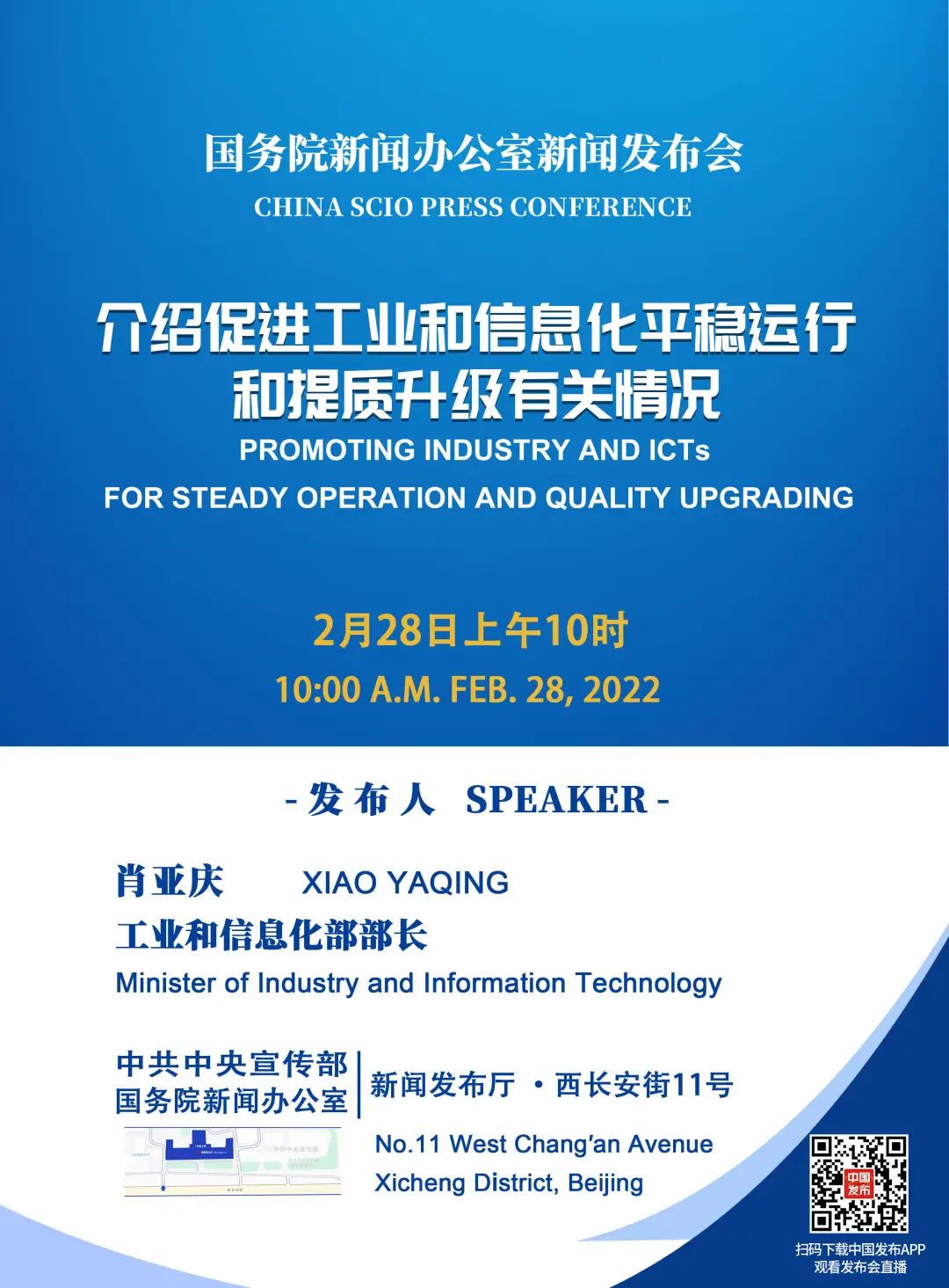 国务院新闻办公室将于2月28日(星期一)上午10时举行新闻发布会。工业和信息化部政务新媒体“工信微报”将及时编发精彩内容,“工信微报”视频号将同步直播,敬请关注。