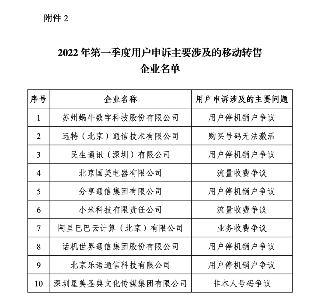 2. 2022年第一季度用户申诉主要涉及的移动转售企业名单