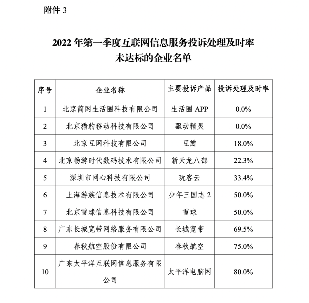 3. 2022年第一季度互联网信息服务投诉处理及时率未达标的企业名单