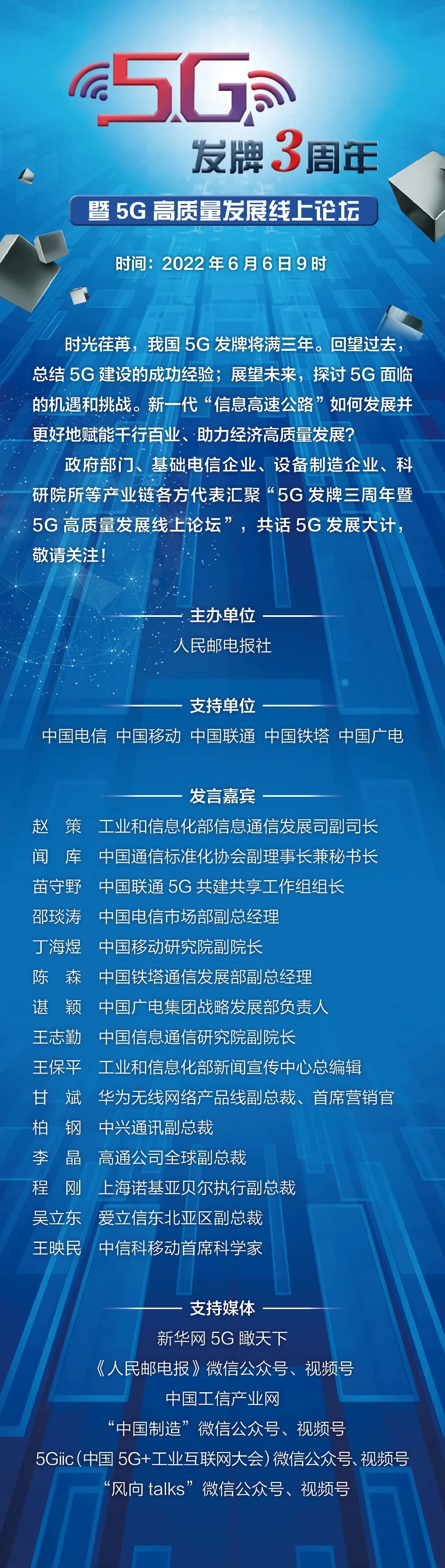5G发牌三周年暨5G高质量发展线上论坛6月6日召开